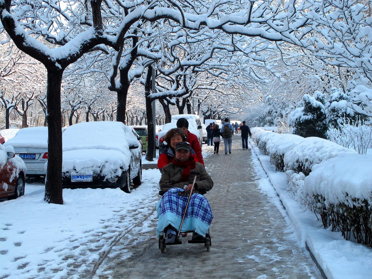 此片2015年1月22号拍于北京市,寒冷的冬天,大雪后的早晨,女儿推着年迈有病父亲,走在冰冻的路上,赏雪尽孝,老人女儿都眉开眼笑。