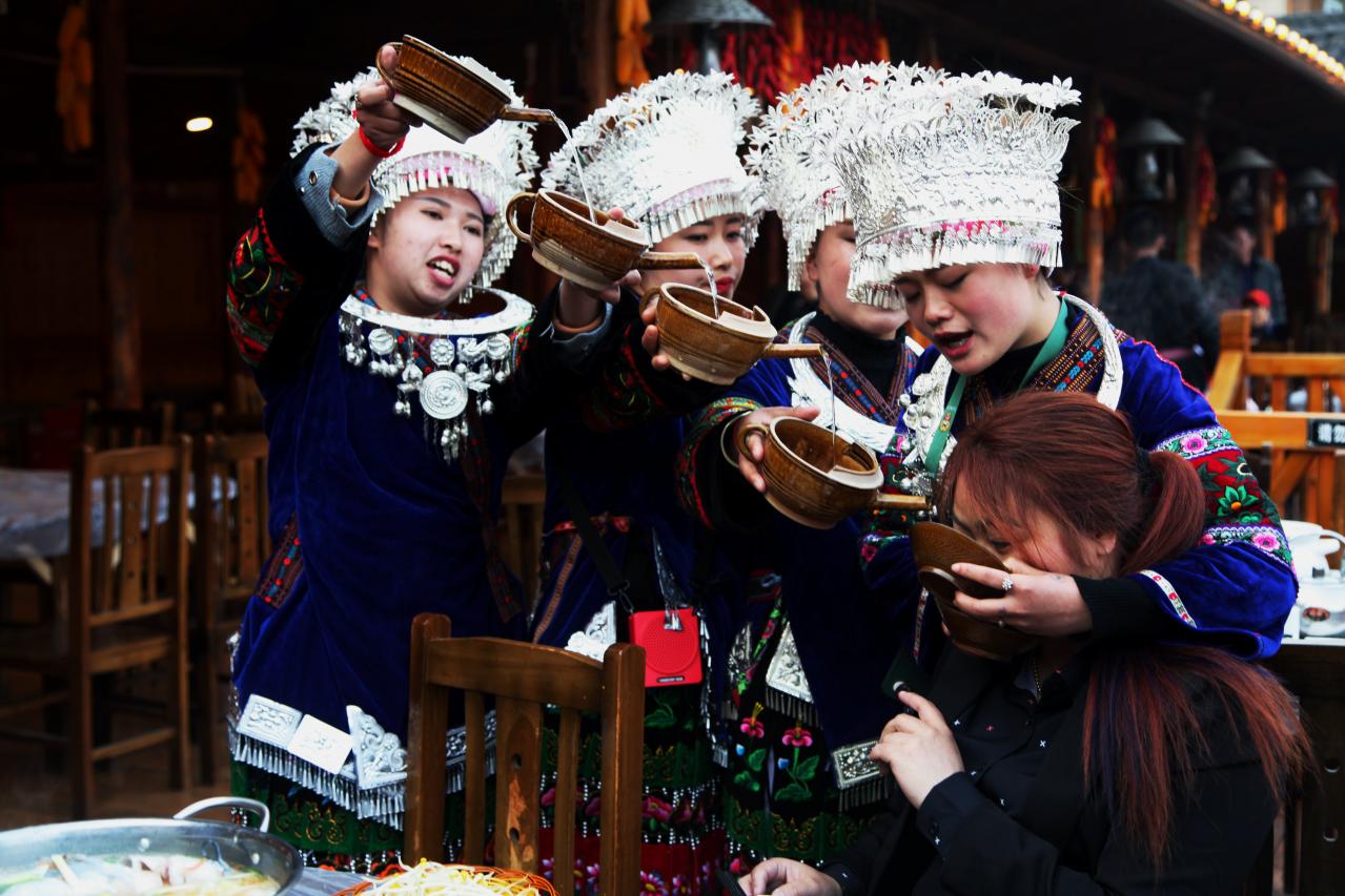 此片2018年2月22号拍于贵州西江,穿节日盛装的苗族少女,对前来旅游的外地女客人表示了非常热情的招待,碗碗美酒敬客人。