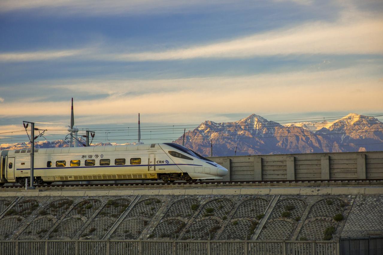 建国初期,出行的难历历在目,如今天山脚下高铁飞奔,是行千里,安全舒适。2016年10月4日拍摄于新疆天山脚下.