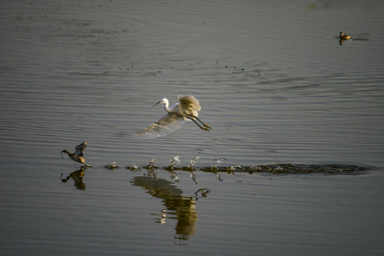 小水雉刚刚捕到一条小鱼,就被一只白鹭发现并猛追过去,上演了一场打劫追逃大战。