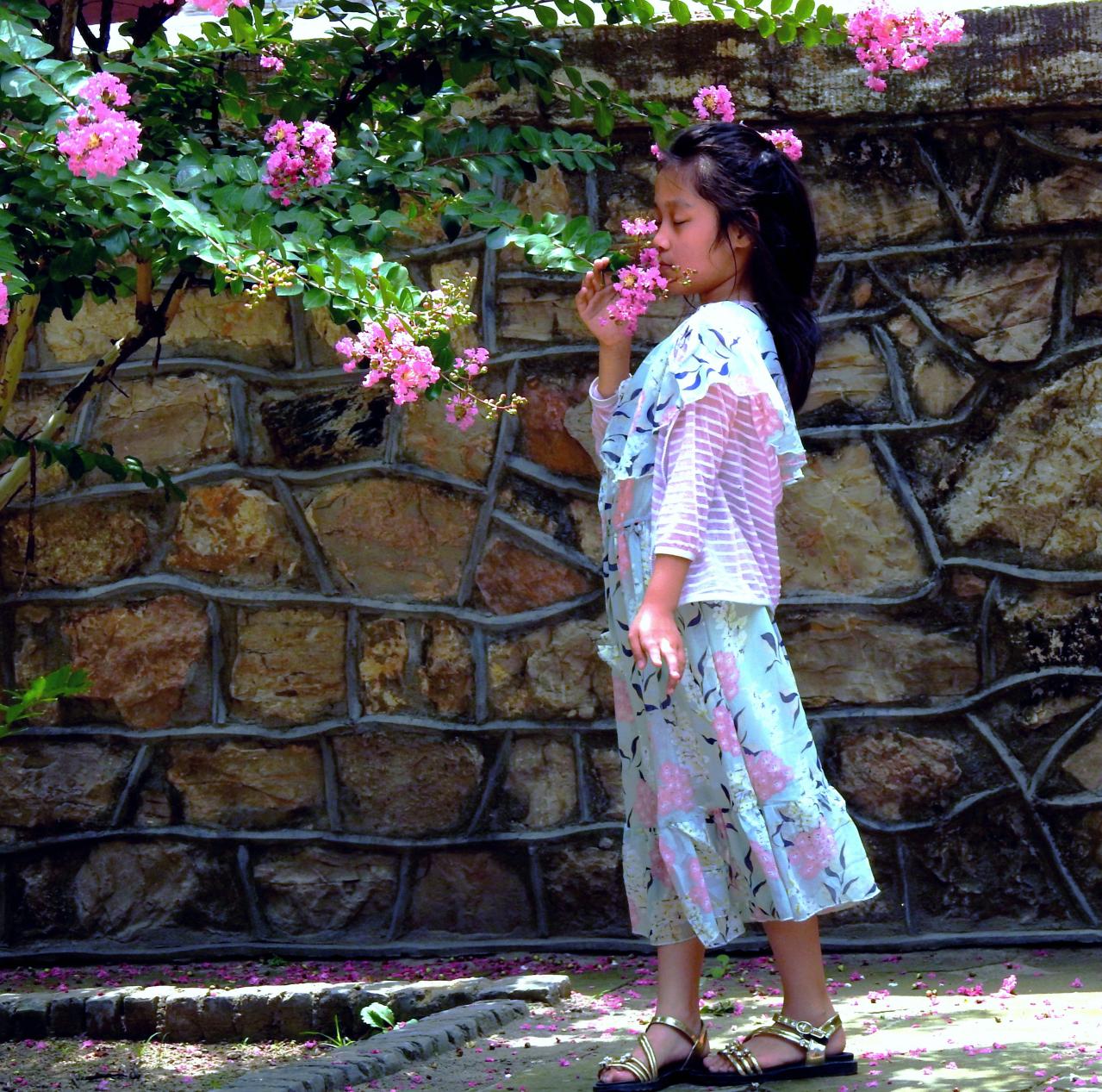 2019.06.30岱庙内园林墙边的紫薇下,一位7岁女孩留着时尚的披发,身着流行的花长裙闭目闻香,恰好有两朵花好像插在头上,一束花在鼻下,又摆了一个美姿,更加突显出温文尔雅人物形象。