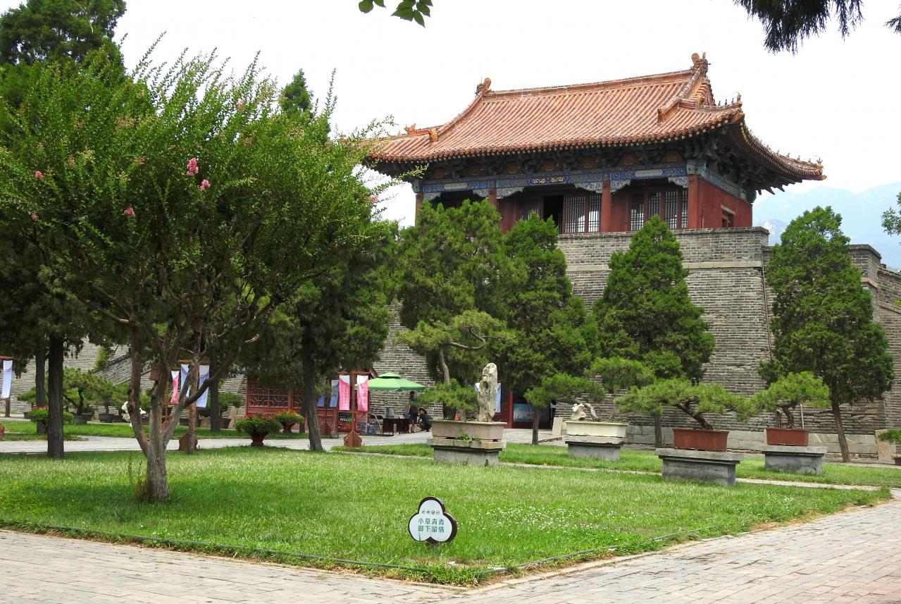 2019.06.30岱庙北门南侧风景。岱庙北门即厚载门,其顶部有阁楼,南侧是园林式绿化地面,方形的绿草地上有花树和松树及很多造型奇妙的盆栽柏树,还有一个花型警示牌。景物及色彩布局合理,层次清晰,对角线构图。“方”的谐音是“芳”,有“流芳百世、万古流芳”的寓意,即取名“芳地圣门”。
