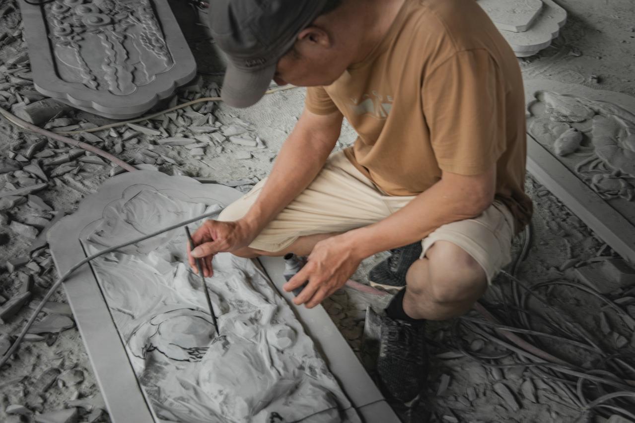 “精画细雕”,2019年6月9日拍摄于福建霞浦石料厂。工人正在精心地绘制图案,雕刻石料。