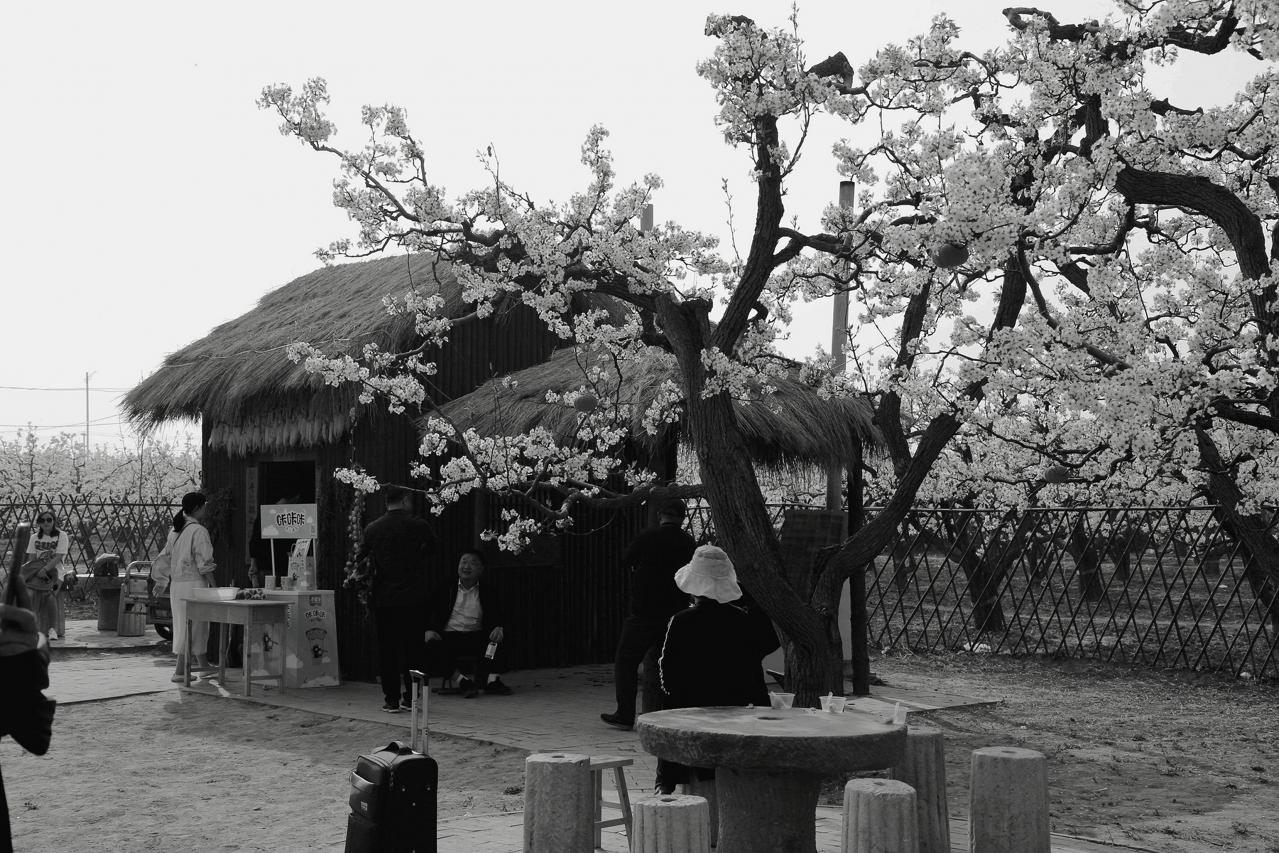 滨州市阳信梨花节,外地游客带着行李箱来赏花。