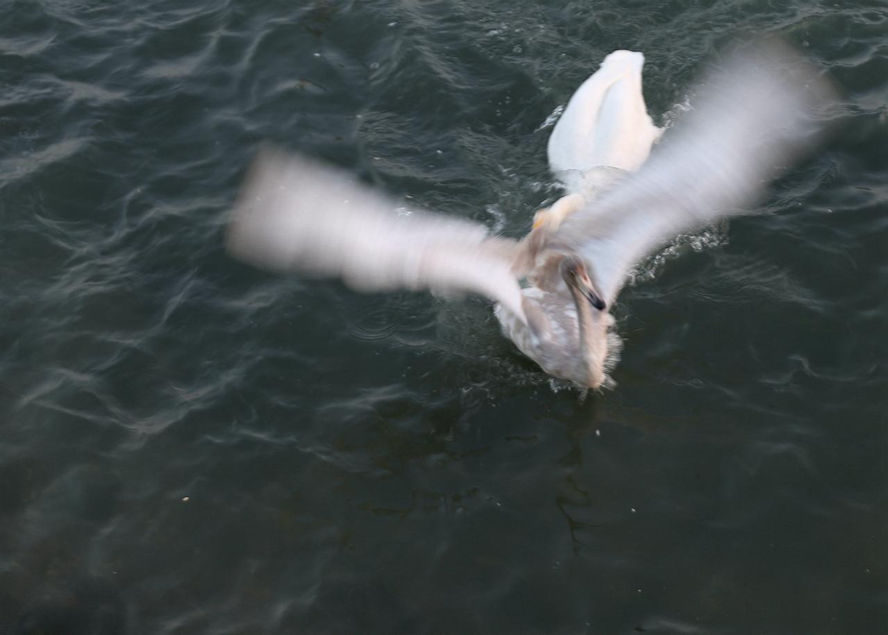 烟墩角天鹅湖,两只天鹅厮杀,一只追赶一只逃离。