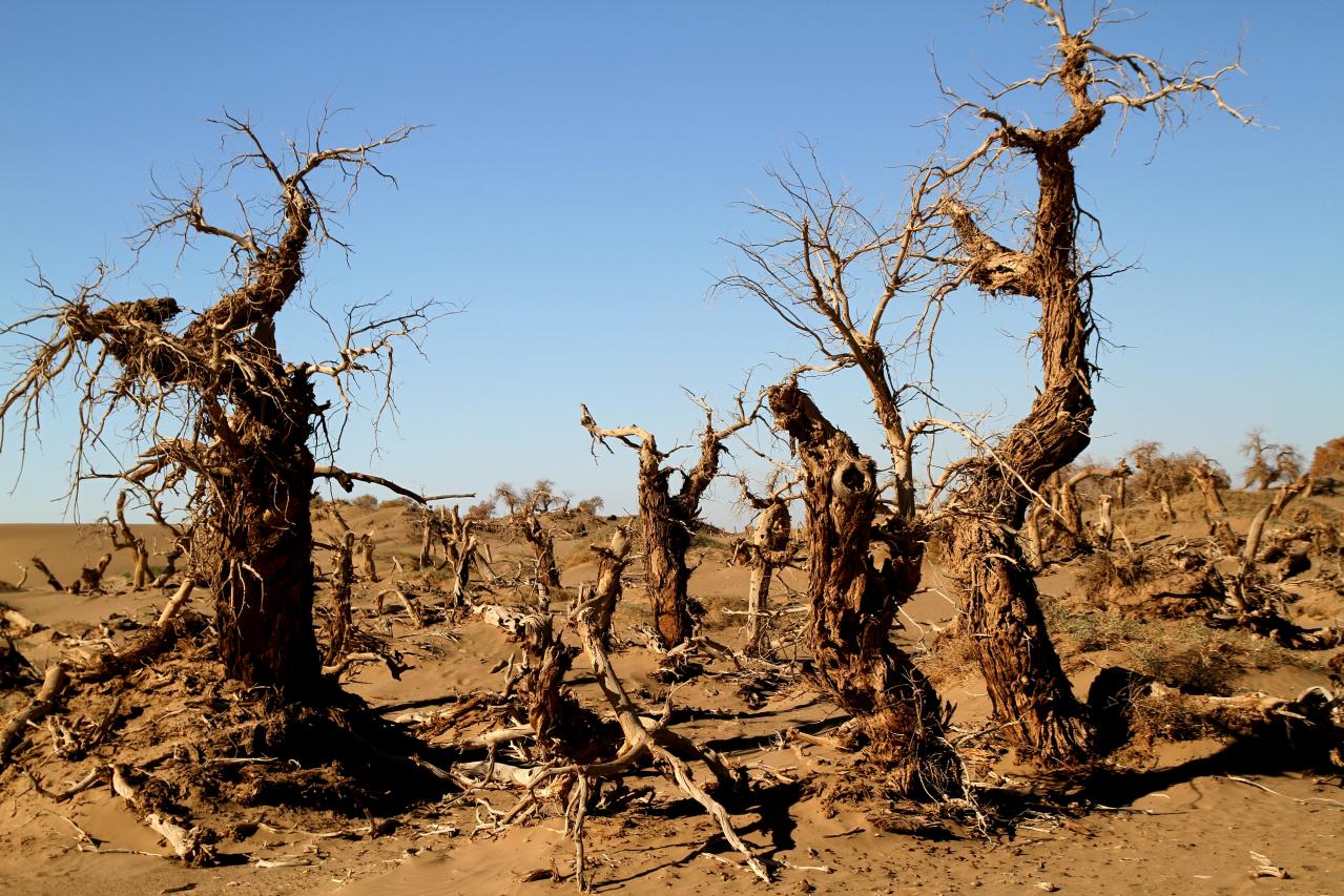 2014年10月17日拍摄于内蒙古额济纳河下游荒漠中的怪树林。此地原为一片茂密的胡杨林,但1990年代由于上游拦河建坝,致使河水断流。胡杨虽极度耐旱,也无法抗拒水源的枯竭,这片林地便成为“胡杨的坟场”。枯死的胡杨看上去狰狞、恐怖,宛如发出声嘶力竭的呼喊,哀求人类出手相救,但它们还是绝望地死去。希望怪树林的形象能够唤起人类保护自然的意识,拯救胡杨就是拯救人类自己的美好家园。