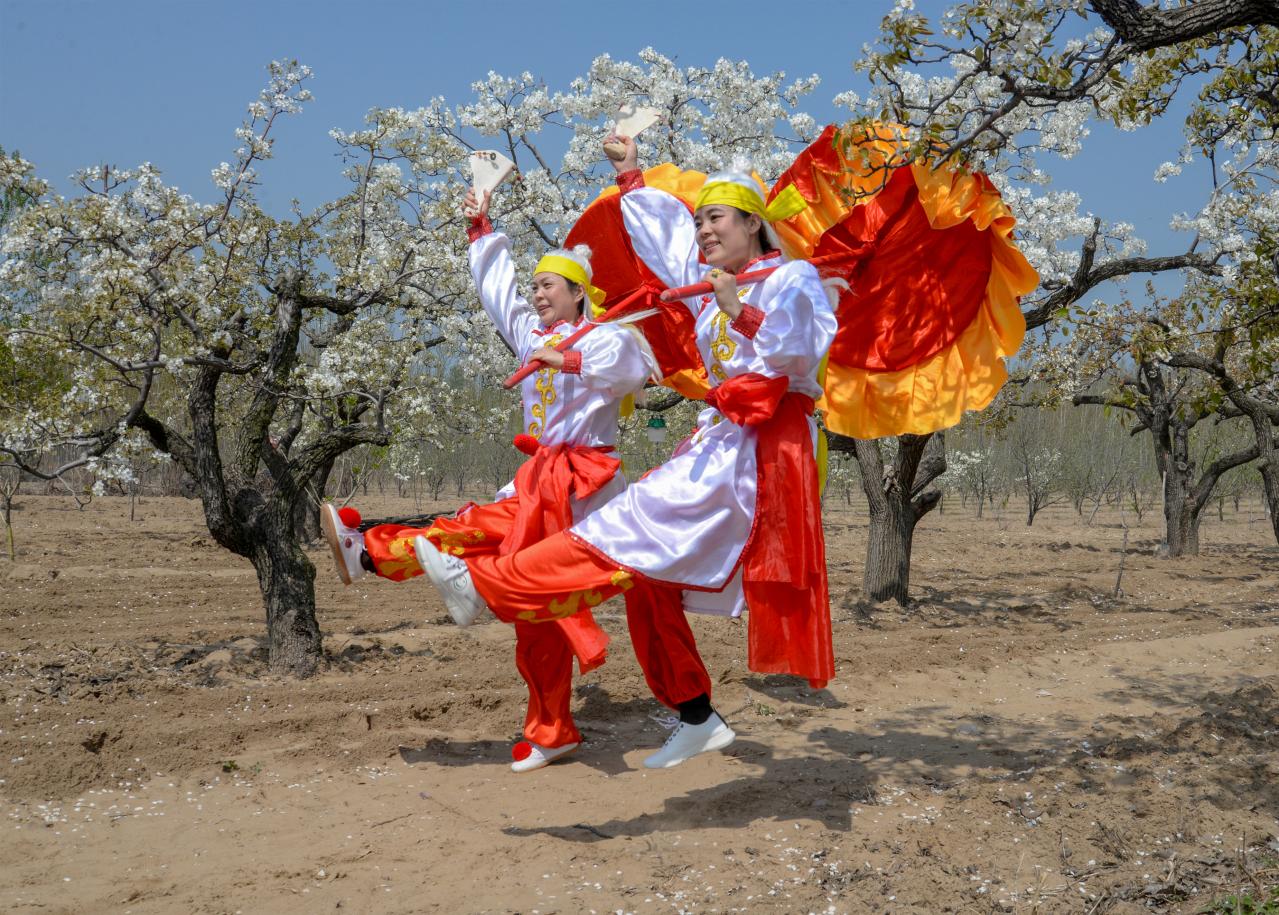 梨花盛开,商河鼓子秧歌艺术团在梨花园内起舞,颂扬农村美景新面貌,欢庆社会主义新时代。