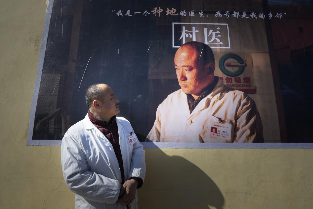 山东肥城潘庄村,刘磊摄影展期间,村医路兴峰站在自己的大幅照片前。