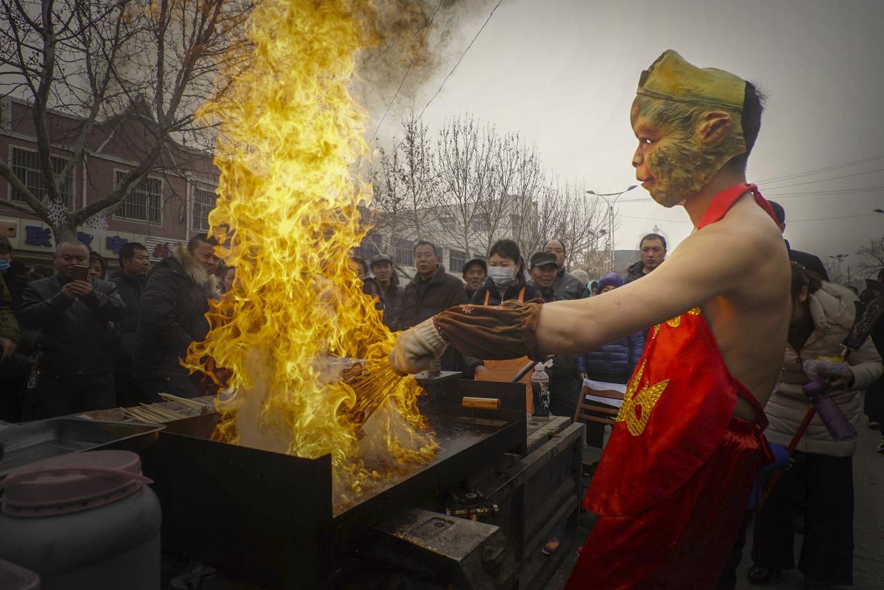 正月庙会上,戴着孙悟空面具的烤肉摊主,赤膊红肚兜加上不时燃烧的火焰,吸引了很多人围观。