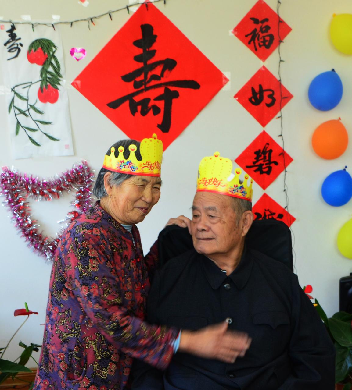 莱阳德怡老年公寓里的老人过生日的照片,这位老人有病多年,老伴对他照顾的无微不至,感动的老人掉眼泪。