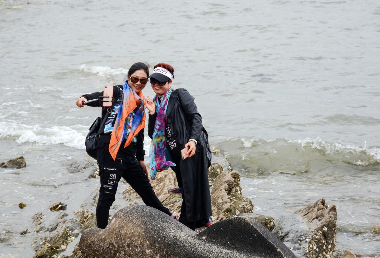 2019年4月的春天,风和日丽,伙伴们一起走出室外,亲近大自然,在海边用自拍杆来个和大海合影