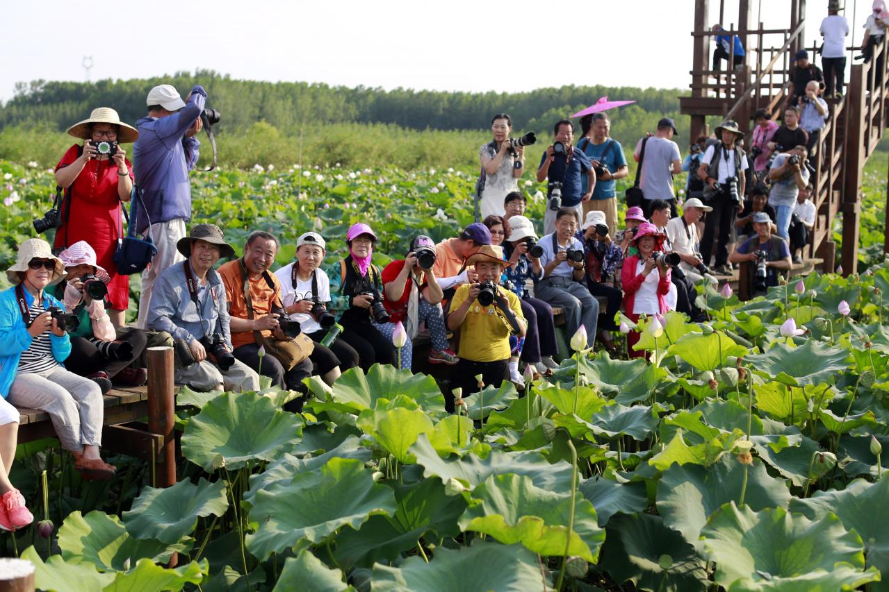摄影师在荷塘里拍照
