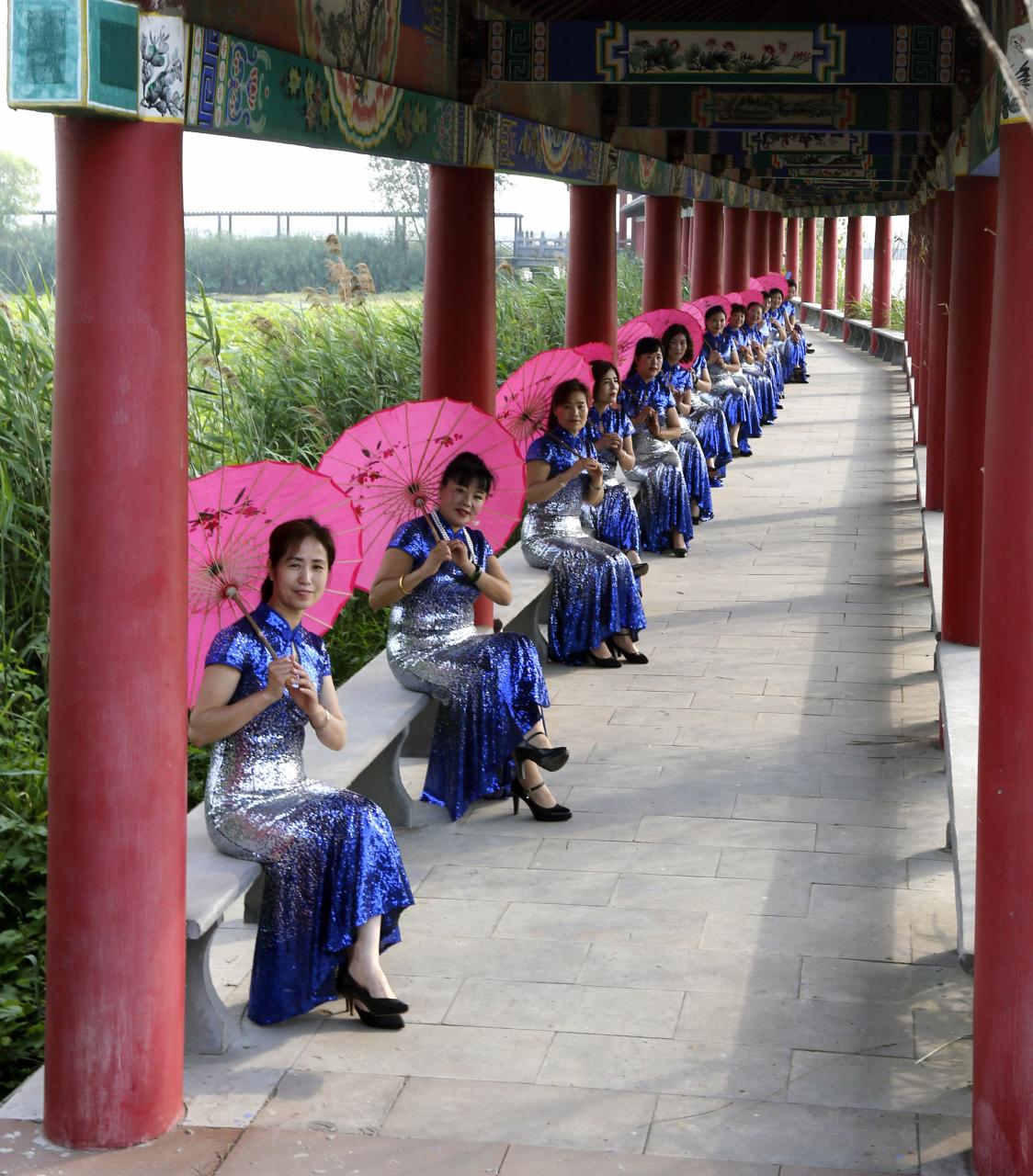 旗袍绣坐在长廊里等着拍照
