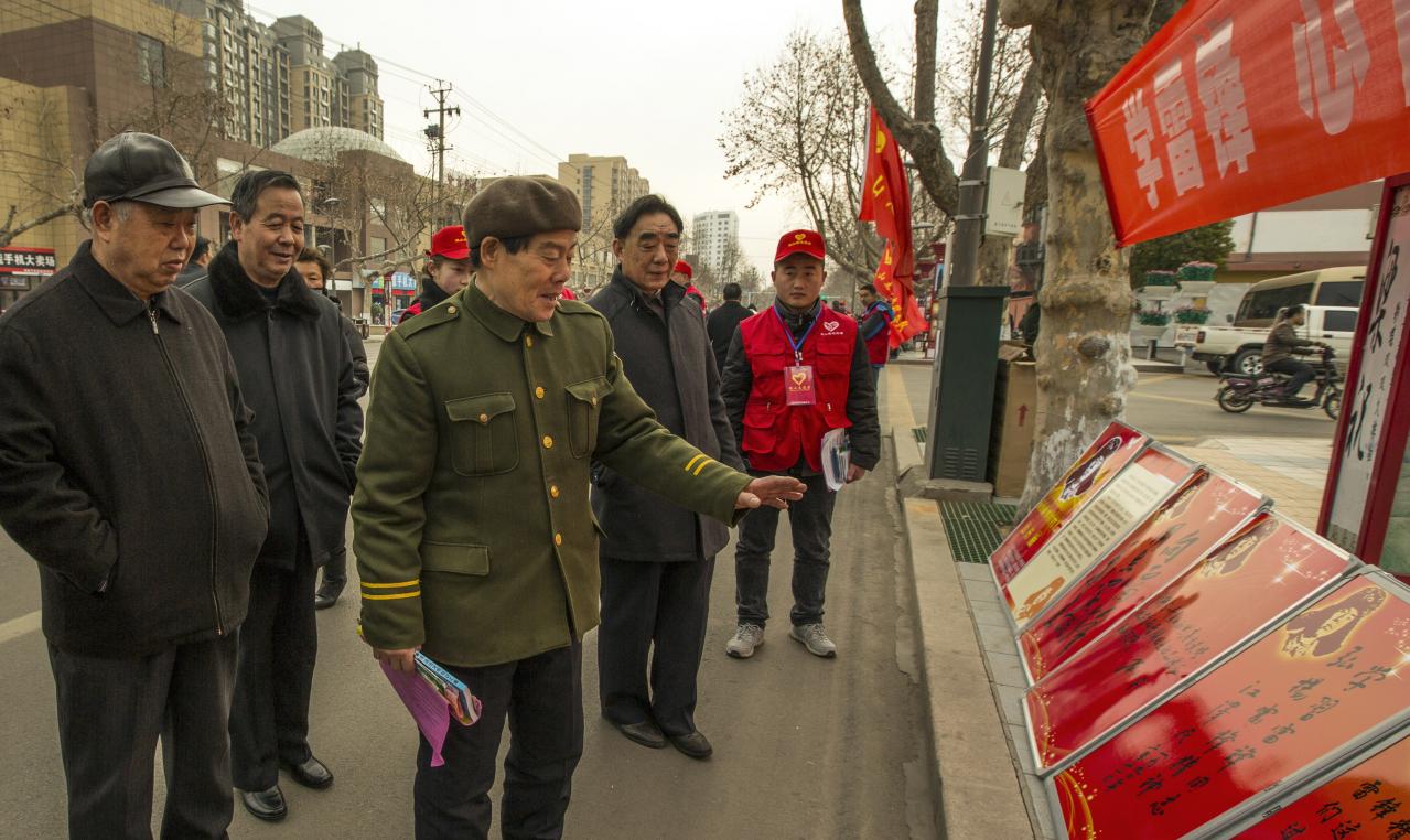 雷锋传播者田传宇用展版宣传雷锋事迹
