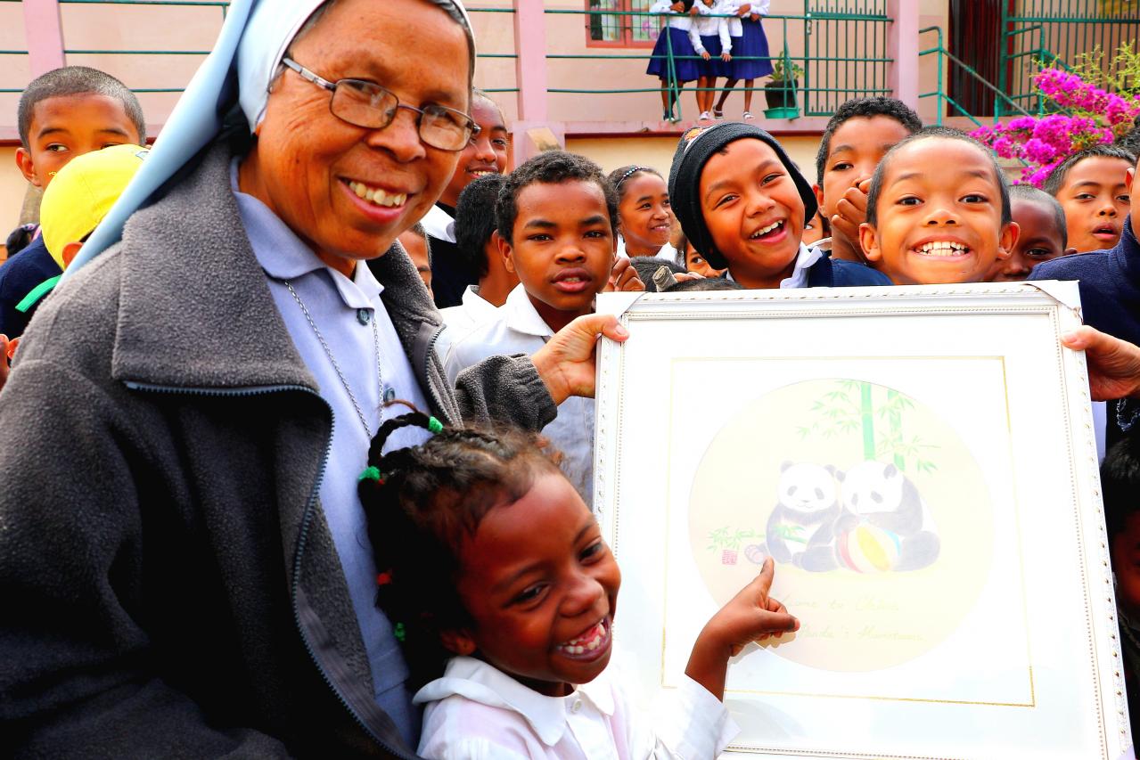 当马达加斯加圣路易斯德贡扎格(Saint louis de gonzague)学校的小同学,看到山东访者赠送的“蜡笔熊猫画”时,羞涩的说“我喜欢熊猫”。2019年6月3日拍摄于马达加斯加