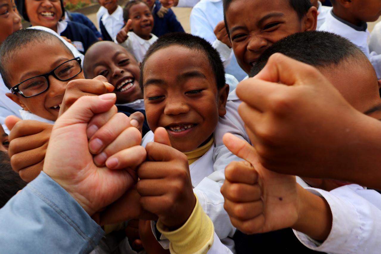 2019年3月,我们访问马达加斯加圣路易斯德贡扎格(Saint louis de gonzague)学校,一所帮助贫困家庭孩子和孤儿读书的学校 ,受到师生们的热情欢迎,纷纷伸出手“顶拳”,表示友好的问候。