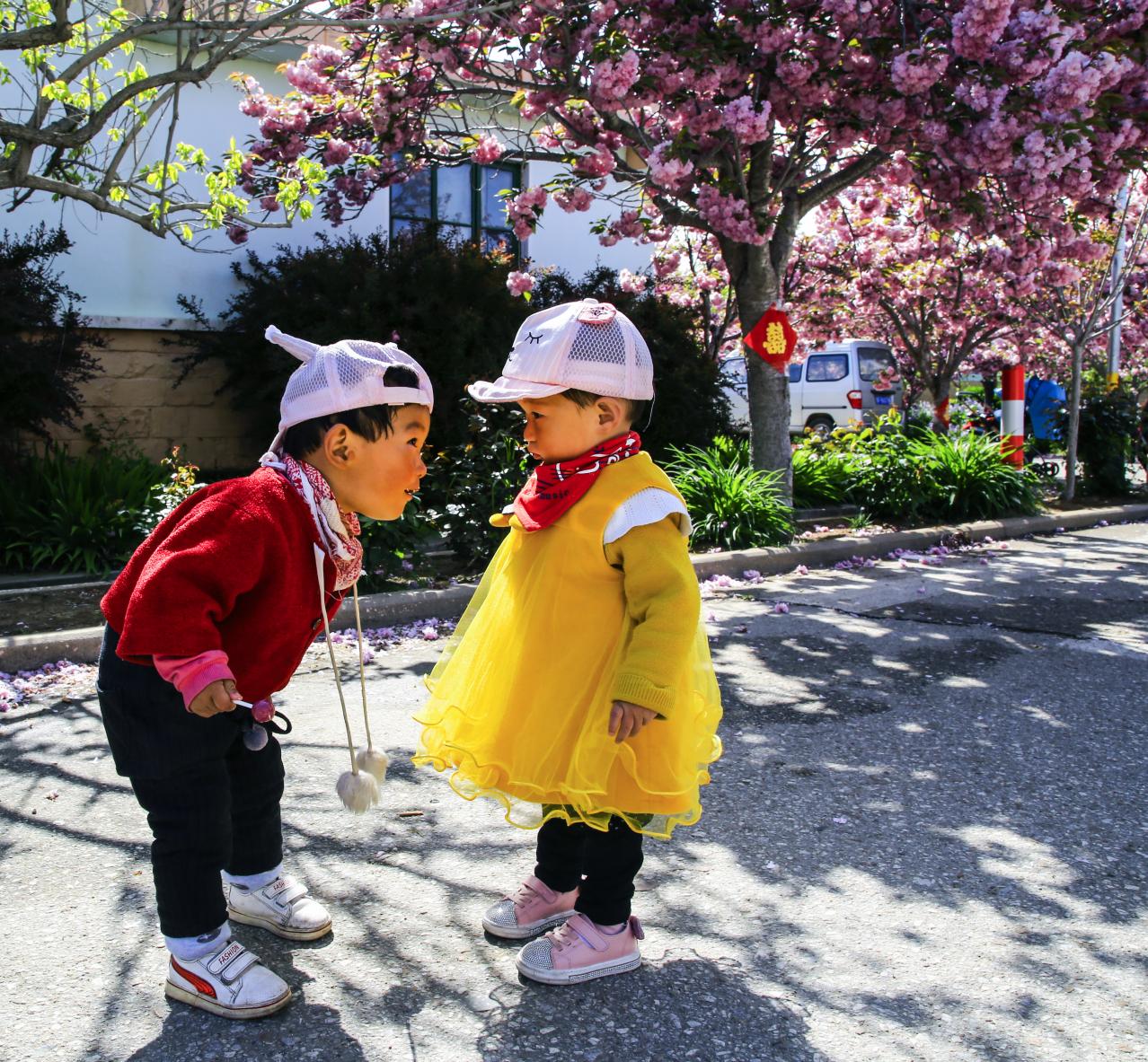 樱花盛开的时候,两个孩子在樱花树下为我们讲述着他们之间发生的有趣故事