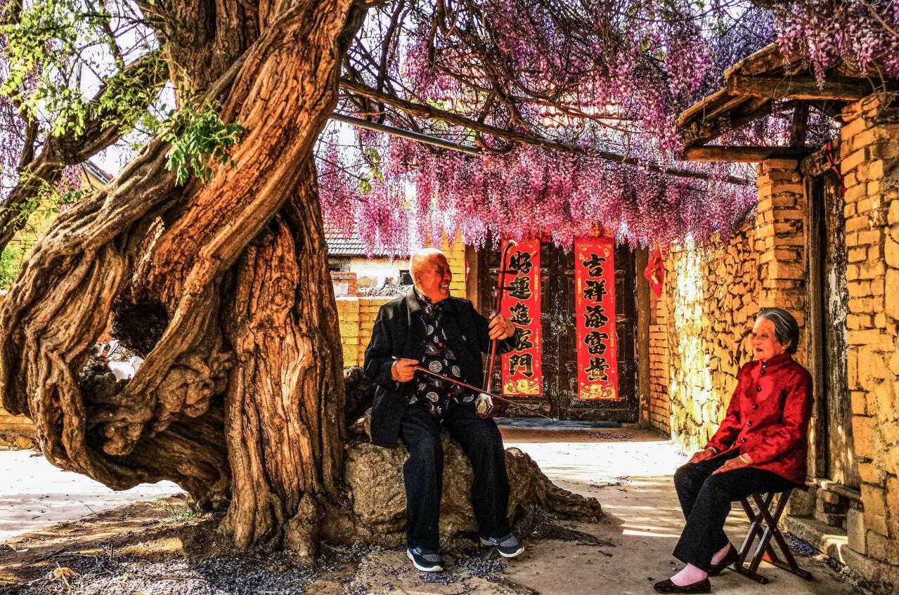 2019年5月拍于莱阳市,柏林庄镇柳古庄村,看一农户家门口一对恩爱夫妻,在一棵千年紫藤缠槐树下乐哈哈的拉着二胡呢。