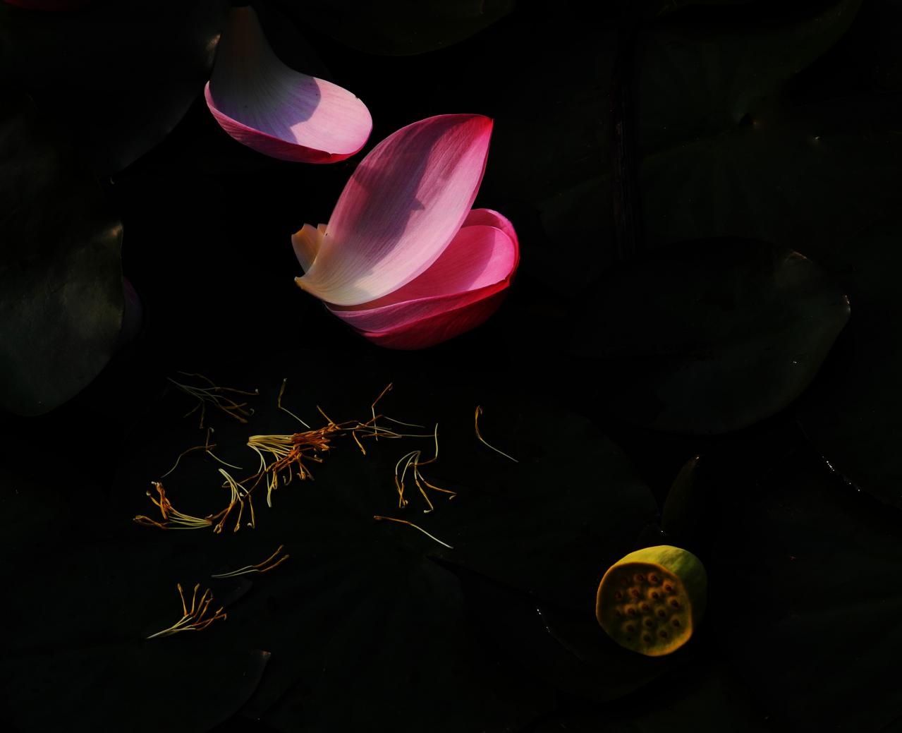 好好一朵亭亭玉立的荷花,被人为的撕碎,可气可恨啊!满叶撒落的花瓣和花蕊丝丝揪心。那粉色的花瓣,金黄色的蕊丝静静的在荷叶上让人们观赏啊! -