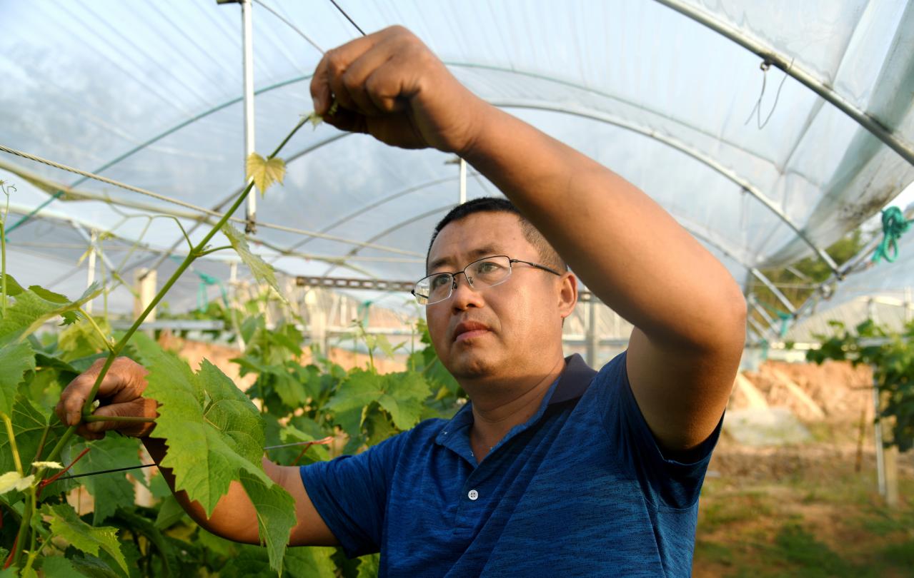 葡萄种植专业户正在对春季长的葡萄进行枝叶修剪