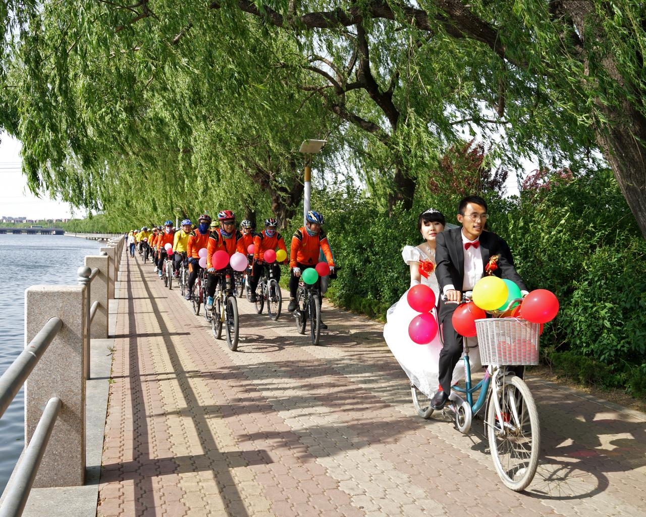2014年5月10日拍于莱阳阳市蚬河边。新郎新娘不要彩礼不要豪车,而是叫同学骑自行车为她们送行。