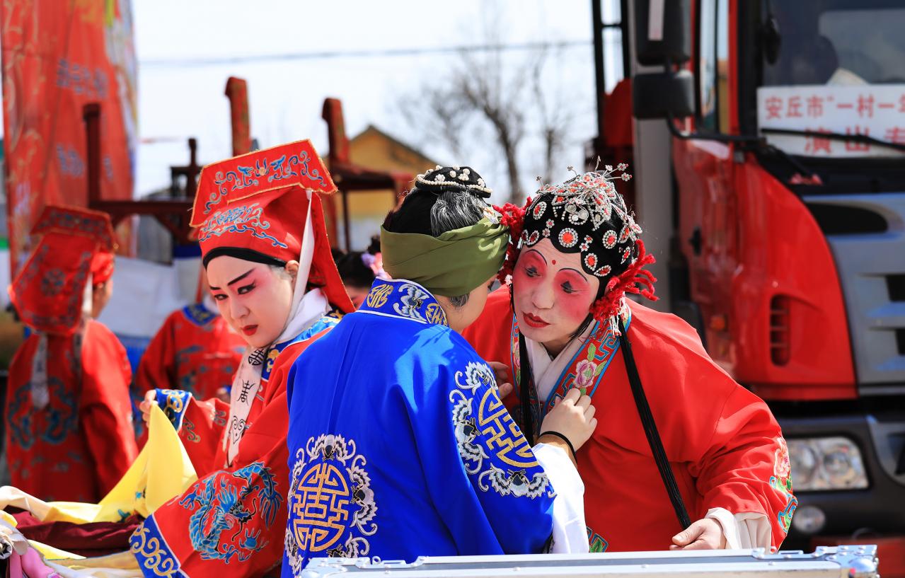 安丘市京剧团下乡演出,演员边化妆边说着悄悄话