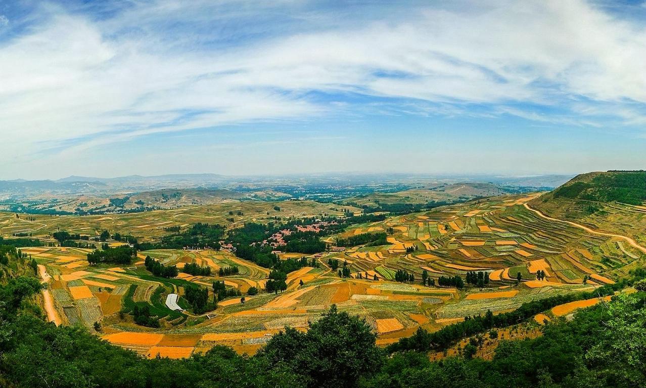 拍摄时间:2016年6月2日 拍摄地点:山东省安丘市吾山镇境内太平山麓。 蓝天白云下的太平山麓成片的江北梯田,一眼望去群山绵绵、绿草青青,麦地金黄、绿树葱葱、红瓦下的村庄在绿树环抱之中,风景这边独好。