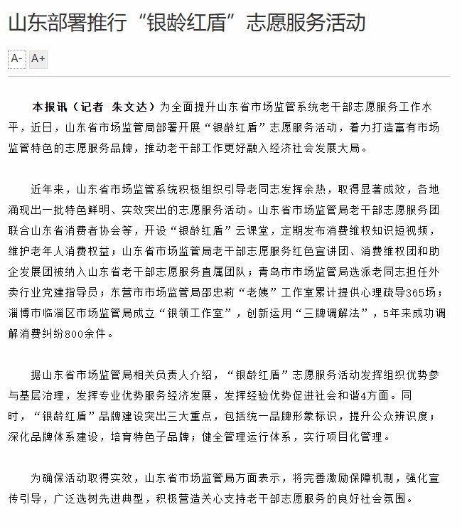 2025年,省市场监管局深入贯彻落实省委老干部局和省局党组决策部署,紧扣“党建引领·银龄增辉”年主题,秉持守正创新、融合赋能工作理念,聚焦政治建设、组织凝聚、服务保障、作用发挥、文化养老五大核心任务,推动老干部工作与全局中心工作同频共振、互促共进,持续保持我局老干部工作走在全省前列。一年来,省市场监管局离退休干部共获得各项荣誉143项,其中集体荣誉40项,个人荣誉103项。 让我们通过2025年省市场监管局离退休干部工作十大新闻,共同回顾省市场监管局离退休干部工作的高光时刻。 一、高标准完成离退休干部党委换届选举工作 9月24日,中共山东省市场监督管理局机关离退休干部第二次代表大会召开。会议认真总结省市场监管局机关离退休干部党委近五年工作情况,研究部署今后一个时期离退休干部党建工作,选举产生了省局机关离退休干部新一届党委。一批党性强、乐于奉献、身体较好、相对年轻的党务工作骨干进入党委班子,党委委员平均年龄65.44岁,班子结构进一步优化,为党建引领各项工作开展提供了坚强的组织保障。 二、省老干部活动中心三个服务平台落户省市场监管局 11月6日,省老干部活动中心驻省市场监管局文体活动指导服务站、山东省老干部摄影协会省市场监管局分会、山东颐心画院省市场监管局分院揭牌仪式在省市场监管局隆重举行。此次成立的三个平台聚焦老干部文体需求,重点开展精准培训指导,按需派驻专业师资推广活动项目;深化活动组织,推动双方社团“结对子”,开展联谊交流、公益服务等活动;加强资源整合与服务协同,精准赋能文化养老,更好满足老同志多样化、多层次精神文化需求。 三、省市场监管局离退休干部党课研学团成立仪式暨首次研学会议 10月14日,省市场监管局离退休干部党课研学团成立仪式暨首次研学会议在省局老干部活动学习中心顺利举行。成立省市场监管局离退休干部党课研学团是我局加强新时代离退休干部党的建设、提升老干部工作质量的一项重要举措,也是我局老干部政治生活中的一件大事,填补了我局政治理论社团的空白。离退休干部党建工作是新时代党的建设伟大工程的重要组成部分。成立党课研学团,其目的就在于依托各位老同志深厚的理论功底、丰富的实践经验和坚定的政治信念,搭建一个专注于党课研究与开发的高质量平台,为各离退休干部党支部开展学习活动提供有力的内容支撑和教学支持。 四、在全省市场监管系统开展“银龄红盾”志愿服务活动 10月23日,省市场监管局在全省市场监管系统推行“银龄红盾”志愿服务活动,印发《关于在全省市场监管系统推进“银龄红盾”志愿服务活动的实施意见》,在全省系统统一标识与工作规范,引导离退休干部重点围绕精神文明建设、基层治理、经济发展、社会和谐四大领域开展志愿服务。鼓励各市局结合实际开展“银龄红盾+”系列特色活动,推动全省系统老干部志愿服务工作规范化、专业化发展。 五、承办省直老干部工作第三联络片合唱展演活动 9月1日,为纪念中国人民抗日战争暨世界反法西斯战争胜利80周年,省市场监管局联合省政府办公厅在省老干部活动中心承办省直老干部工作第三联络片纪念中国人民抗日战争暨世界反法西斯战争胜利80周年合唱展演活动。此次展演活动传承和致敬了伟大抗战精神,激发了广大老同志的民族自豪感与爱国情怀,激励他们继续发挥优势作用,为新时代现代化强省建设贡献智慧与力量。 六、省市场监管局喜获全省老干部艺术节集体金奖 9月,第十一届全省老干部艺术节圆满落幕,省市场监管局离退休干部在此次艺术盛会上大放异彩,以卓越表现斩获集体金奖和组织奖,展现了市场监管系统老干部昂扬向上的精神风貌和深厚的艺术素养。党组书记、局长吴承丙作出批示:“祝贺取得好成绩。再接再厉,将老干部文化活动组织好。”党组成员、副局长、一级巡视员于智勇也专门表示祝贺,并勉励大家继续努力。 七、省市场监管局离退休干部同社区融合共建再添新举措 3月12日,省市场监管局离退休干部党委与舜耕街道舜华社区签订《绿色生态共建协议》,宣布成立“舜华护绿志愿队”,这是一支由社区党员、居民代表组成的服务队,省市场监管局离退休干部第十五党支部书记、离退休干部志愿者团团长王速成担任队长,“舜华护绿志愿队”将常态化参与社区绿化维护与环保宣传。 八、开展离退休干部助力抓改革创新促高质量发展活动 3月,为助力抓改革创新促高质量发展,切实增强老年消费者的自我保护和依法维权能力,进一步激发消费活力,优化消费环境,山东省市场监管局离退休干部党委联合省消费者协会和辅仁社区党委在历下区龙洞街道辅仁社区举办“银发消费课堂”活动,活动邀请省消费者协会投诉部主任、中国消费者协会优秀调解工作人员、山东省高级人民法院特邀调解员张晓盟主任讲解《银发经济中的消费陷阱与规避技巧》,离退休干部和社区居民约100余人参加活动。 6月,联合山东省消费者协会、《老干部之家》杂志社建立常态化协作机制,构建“理论支撑+实践服务+宣传推广”三位一体的志愿服务体系,在《老干部之家》杂志开设专栏,以消费警示、以案说法等为老年消费维权,通过《老干部之家》杂志线下35万读者及线上读者观众,全媒体渠道广泛