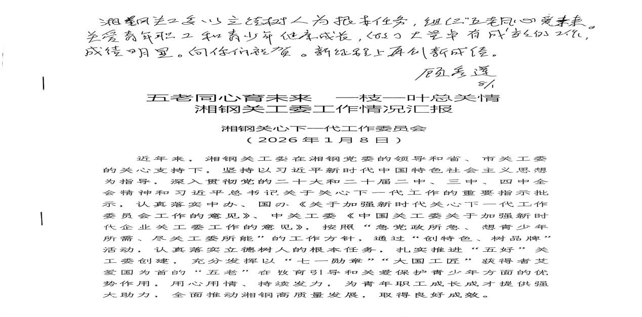 “湘钢关工委以立德树人为为根本任务,组织“五老”同心爱未来,关爱青年职工和青少年健康成长,做了大量卓有成效的工作,成效明显,向你们祝贺,新征程上再创新成绩。”在深入现场调研湘钢关工委工作后,中关工委主任顾秀莲在工作汇报材料上欣然题词点赞湘钢关工委工作。