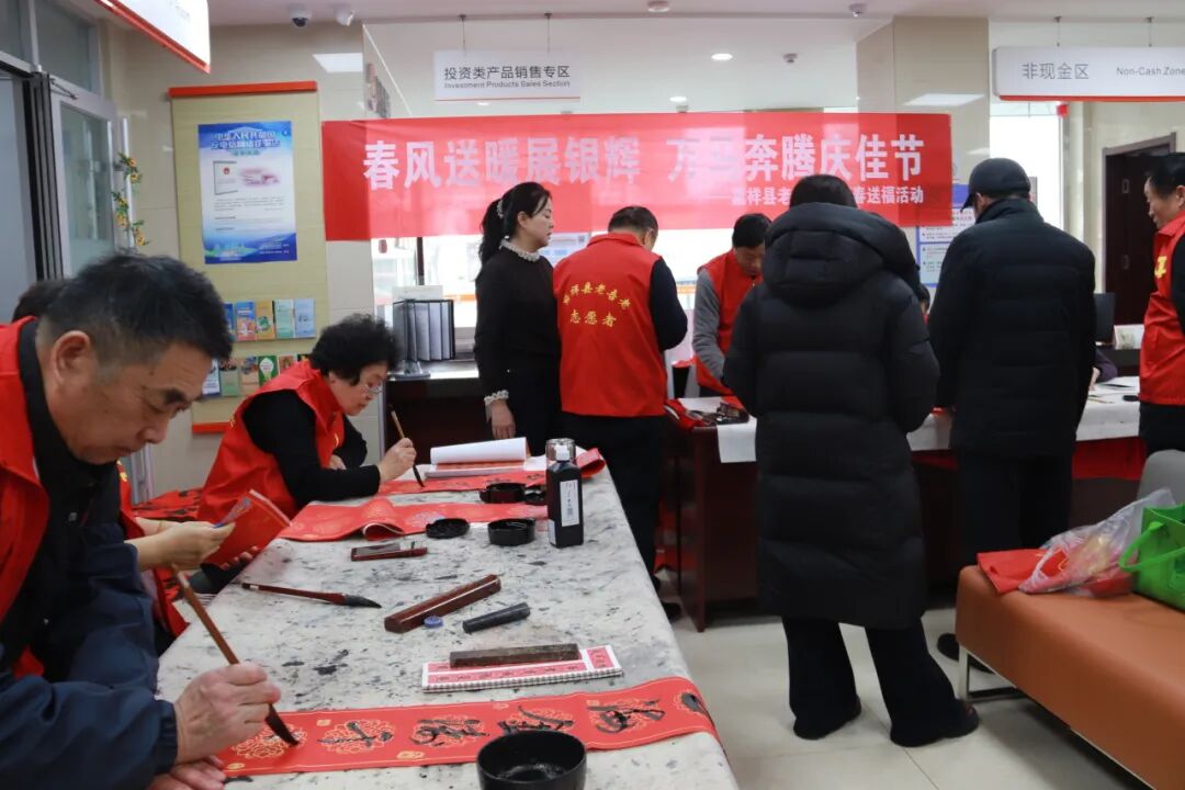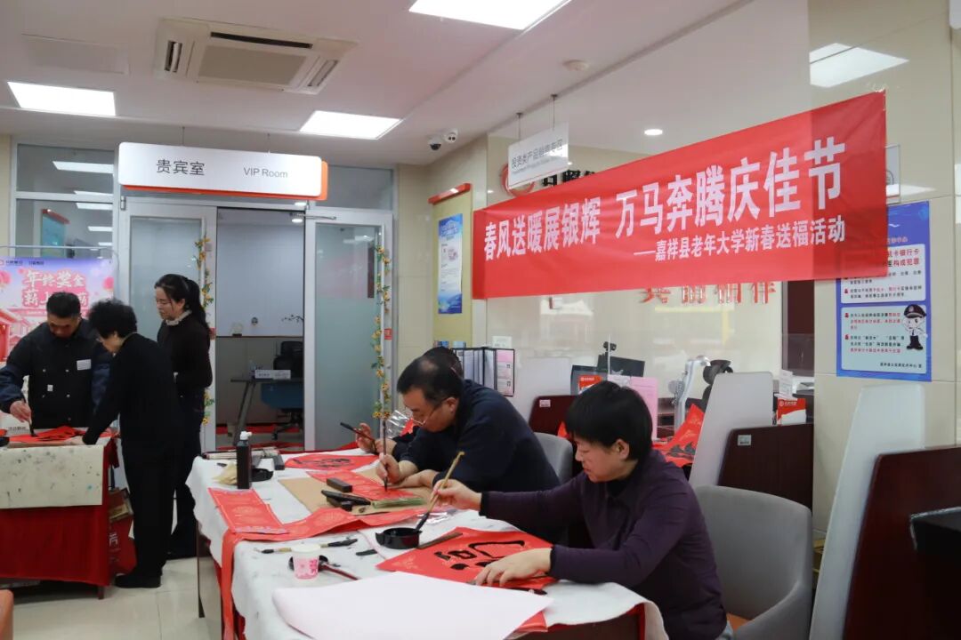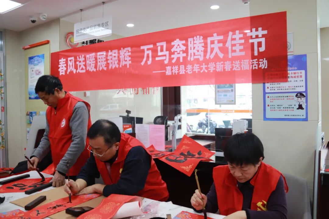 岁末腊至,年味渐浓。为传承中华优秀传统文化,营造喜庆祥和的新春氛围,1月28 日,济宁市嘉祥县老年大学“春风送暖展银辉 万马奔腾庆佳节”新春送福系列活动正式拉开帷幕。10余名书法班志愿者满怀热忱,以笔墨为媒,走进日照银行开展首场送福活动,为群众送上充满文化气息的马年新春祝福。