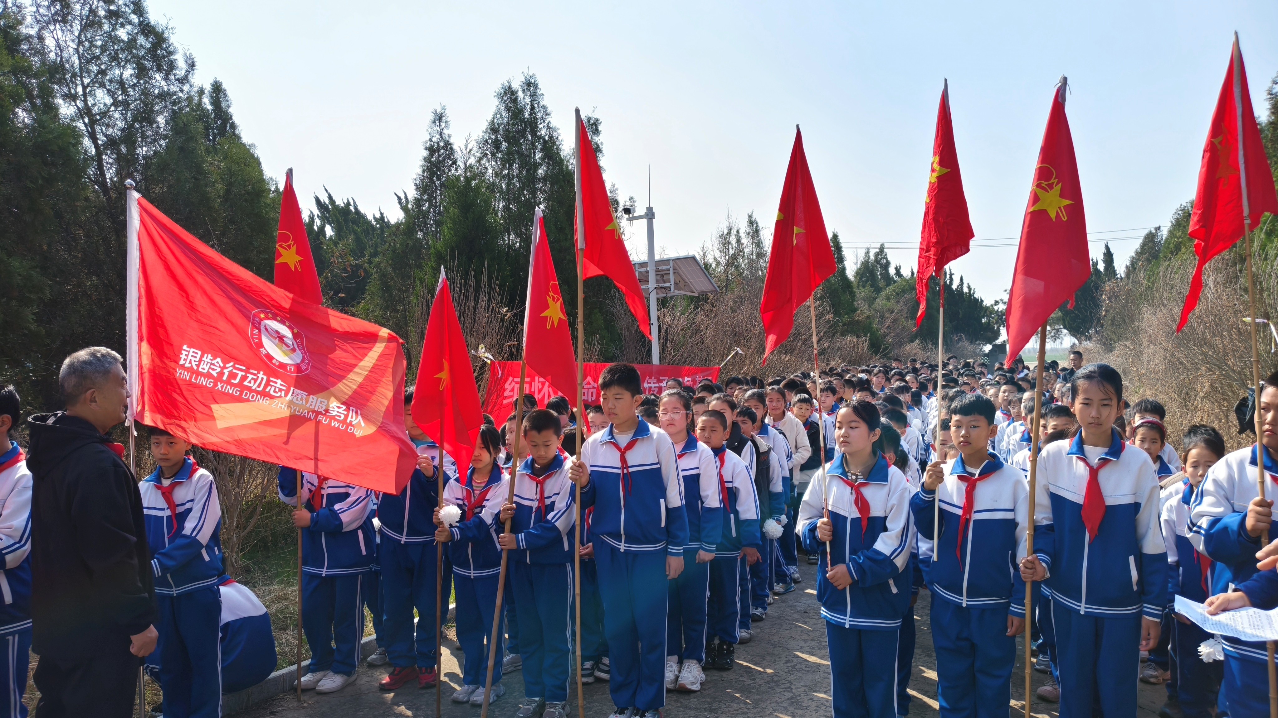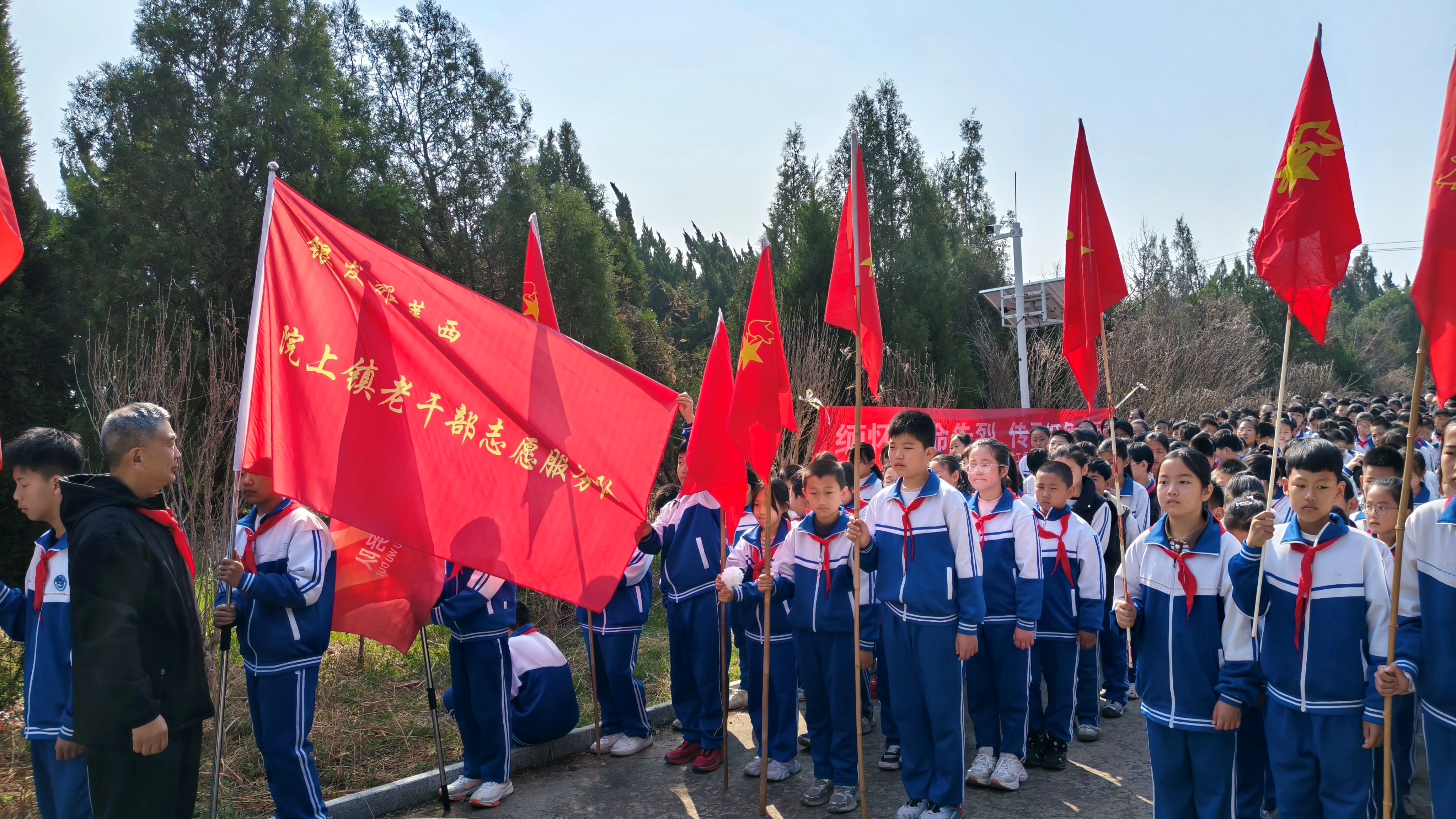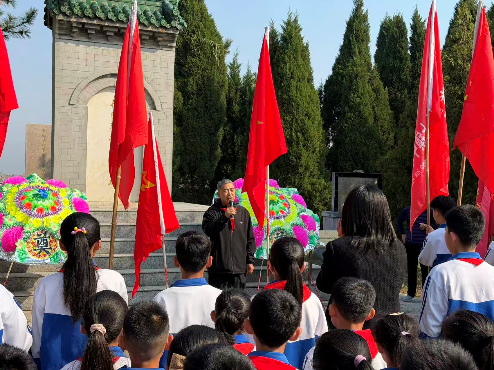 “1938年3月17日,花园头村的村民、民先队员们,在中共莱阳县委的领导下,手持土枪、大刀、铁锨、铡刀等简陋武器,奋勇阻击装备精良的日军,成功毙敌75人,粉碎了日军侵占莱阳、打通胶东通道的图谋,打破了‘日军不可战胜’的神话,打响了胶东平原民众抗日的第一枪。” 4月2日,清明节前夕,山东省莱西市教体局关工委、院上镇关工委与水集街道关工委联合组织院上镇中心小学师生,在花园头抗日纪念碑前开展传承红色血脉主题活动。活动现场,院上镇“五老”工作室主持人昌中南娓娓道来,带领在场学生穿越历史烽烟,重温那场血肉相搏的花园头抗日阻击战。