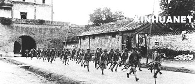 驻守北平宛平城的中国军队奔赴卢沟桥抵抗日军。