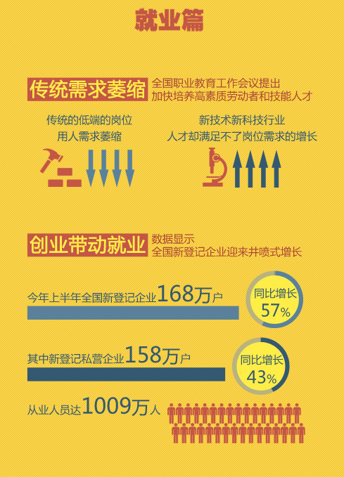 一个新的名词正为越来越多人所熟悉——“新常态”。随着中国经济进入新常态,变化的不只是政策导向、产业布局和官员心态,还有普通百姓的日常生活。 物价:吃饭实惠了 日常消费可能悄然增加 进入2014年,即便面临较大的经济下行压力,中央财政用于民生领域的支出却不减反增,小微企业税收减免,城乡基础设施建设、教育医疗及社保改革等领域的投入均取得重要进展。 此外,受惠于始终维持在2.5%增幅以下的稳定低位物价水平,餐饮购物、休闲旅游、电影戏剧、书籍阅读……老百姓可消费,能消费的选择更多了,频次也更密了。 然而,随之而来的,新的烦恼也产生了。 近日,新婚不久的小李夫妇发现,每月的工资似乎总不太够用,开销总在增加,可单个看起来,电信资费,银行收费,医疗费用……不都在下调吗,这又是为什么呢? 仔细分析一下,不难发现,智能手机、互联网电视、高清盒子、智能手环……如今眼花缭乱的电子产品更新换代是越来越频繁了,原本单一的宽带上网费之外又增加了手机上网费;社区垃圾分类处理了,卫生费却也上调了;买了房的供房还贷压力大,没买房的房租年年上涨…… 从以投资为主导的经济模式转向扩大消费的发展战略,鼓励消费,促进民生,但当消费支出更多了的时候,这样一个新常态,你我适应了吗? 低通胀运行态势下,是否就能高枕无忧了? 专家指出,展望未来,资源产品价格改革、人口结构变化带来的劳动力价格上涨、鲜菜价格的“大年”特征和猪周期调整到位,这些或许都将是推高物价涨幅的隐忧。 在坚定“多谋民生之利,多解民生之忧”的方针指引下,新常态还将有更多的挑战需要应对。 就业:创业显井喷 传统行业就业需求萎缩 经济增速放缓了,就业会不会受到影响?经济结构调整了,工人会不会丢掉“饭碗”?大规模刺激政策取消了,失业率会不会上升? 7月29日,习近平总书记主持召开中共中央政治局会议,指出“要着力保障改善民生,继续完善就业创业扶持政策。” 事实上,随着简政放权、定向调控、相关产业财税扶持政策等多项改革举措的步步落子,创业环境前所未有的宽松。 江苏省靖江市,三艾网络科技有限公司是一家刚刚起步的互联网企业。在相关产业和财政政策的扶持下,该企业享受到了减半征收企业所得税的福利,年节约成本41016元。同时还吸纳100多名大学生就业。 新常态下,以创业带动就业渐成“新风景”。数据显示,全国新登记企业迎来井喷式增长,今年上半年全国新登记企业168万户,同比增长57%。其中新登记私营企业158万户,从业人员达1009万人,同比增长43%。 9月9日,李克强总理在与出席2014夏季达沃斯论坛的企业家代表对话交流时透露,截至8月份,今年城镇新增就业已经接近1000万,接近全年目标。 不过应该看到,靓丽数字背后,仍然存在就业结构性矛盾,传统的低端的岗位用人需求萎缩,而与新技术新科技联系紧密的行业,人才却满足不了岗位需求的增长。 今年6月,国务院召开全国职业教育工作会议,明确提出加快培养高素质劳动者和技能人才,正是意在为推动经济发展和保持比较充分就业提供支撑。 收入:城乡差距渐缩小 百姓理财更趋多元 收入是民生之源。百姓对于经济好坏最直观的感受,莫过于收入的增减。 2014年上半年的经济“成绩单”显示,全国居民人均可支配收入实际增长8.3%,超过GDP增速;农村居民人均现金收入实际增长快于城镇居民人均可支配收入2.7个百分点,城乡居民人均收入倍差缩小。 但在经济格局转型变化的背景下,不同行业的民众也出现了冷暖两知的情况。 一方面,服务业特别是现代服务业飞速发展,为越来越多的人提供了更为广阔的就业渠道和更具吸引力的薪酬。 而另一方面,随着经济结构的调整,钢铁、船舶、煤炭等产能过剩行业举步维艰,许多企业出现减发、欠发、缓发工资的现象,一部分人收入受到影响。 与此同时,伴随着互联网金融的崛起,老百姓投资理财的门槛大幅降低,渠道愈加多元化,“动动手指”就可以让“钱袋子”实现保值增值。 种种变化,源于以“稳增长、调结构、促改革、惠民生”为目标的一系列政策指引。 8月29日,中共中央政治局召开会议,审议通过了《中央管理企业负责人薪酬制度改革方案》,更是直接向央企高管动辄数十万、上百万的年薪“动刀”。