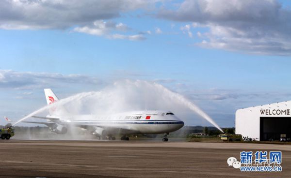 21日傍晚,习主席乘坐的专机抵达楠迪国际机场。东道主特地安排了两辆水车。当专机尚在跑道滑行时水车一起向空中喷水,组成壮阔的“水门”,专机穿水门而过。这是当地给予最尊贵客人的礼遇,表达为客人“洗尘”之意。