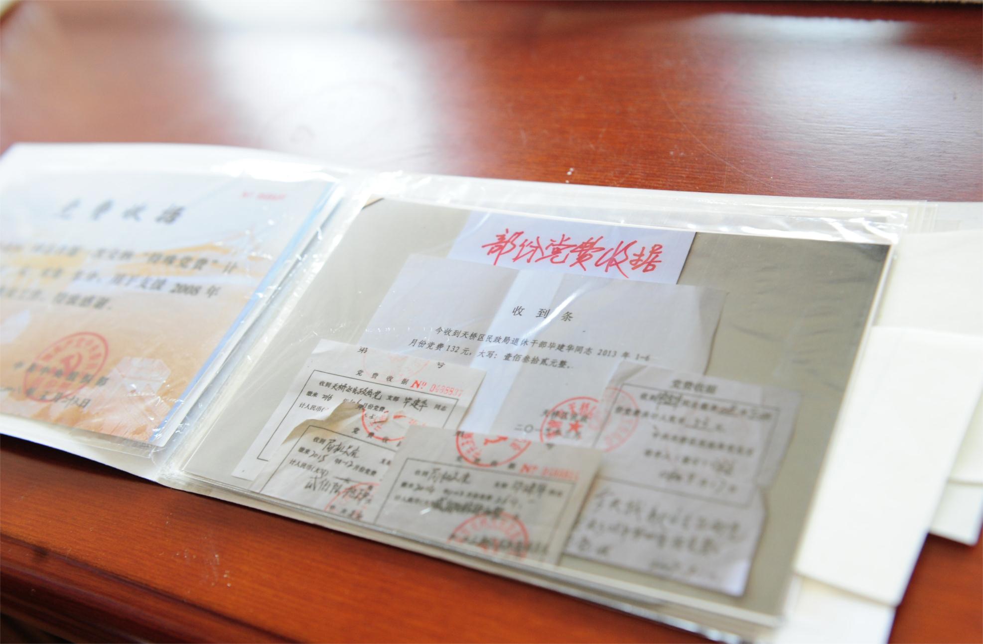 在严干口中,老伴儿毕建华工作一直勤勤恳恳,多次受到单位的表彰,每次交党费时总是第一个主动交给党组织,2008年汶川地震时,更是向组织交了4000元特殊党费用于抗震救灾,平时也多次向红十字捐款。严干说,自己和老伴儿离休后也积极向党组织靠拢,哪怕在老伴儿生病后没法学习了,自己也会跟她讲自己所学的党的方针政策。在严干和毕建华心中,有三条铁一般的纪律:一是时时刻刻想着党的利益,二是时时刻刻想着群众的利益,三是要注意保密制度,不能泄露党的机密。这三条纪律从严干和毕建华入党那刻起一直铭记于心,指导着他们的工作生活。 毕建华把党费收据都保留下来 严干表示,自己和老伴儿受党的教育都70多年了,一辈子为党工作,在离休后有离休费、有医疗费,还有房子住,生活地很充裕,这些都是因为党的培养和照顾。“我们如今把自己积攒的工资上交,不是为了什么功名利禄,就是想借此表达我们两个老党员对党的最真挚的感谢之情。”严干说,“现在全国都在组织老同志为党的事业增添正能量,希望我们的行为也能为党增添点正能量。”