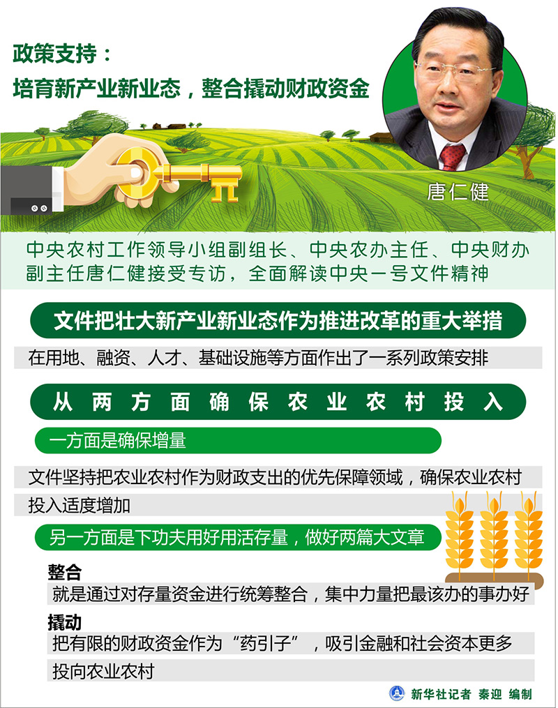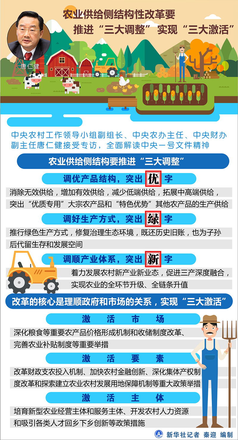 两大板块:结构调整和改革 唐仁健在解析文件内容时说,农业供给侧结构性改革包括结构调整和改革两大板块。其中,农业供给侧结构要推进“三大调整”—— 调优产品结构,突出“优”字。消除无效供给,增加有效供给,减少低端供给,拓展中高端供给,突出“优质专用”大宗农产品和“特色优势”其他农产品的生产供给。文件提出要统筹调整粮经饲种植结构,发展规模高效养殖业,做大做强优势特色产业,优化农业区域布局,提升农产品质量和食品安全水平。 调好生产方式,突出“绿”字。推行绿色生产方式,修复治理生态环境,既还历史旧账,也为子孙后代留生存和发展空间。文件提出推进农业清洁生产、大规模实施农业节水工程、集中治理农业环境突出问题、加强重大生态工程建设等。 调顺产业体系,突出“新”字。着力发展农村新产业新业态,促进三产深度融合,实现农业的全环节升级、全链条升值。文件提出大力发展乡村休闲旅游产业、推进农村电商发展、加快发展现代食品产业、培育宜居宜业特色村镇等。 而改革的核心是理顺政府和市场的关系,实现“三大激活”—— 激活市场。深化粮食等重要农产品价格形成机制和收储制度改革、完善农业补贴制度等重要举措。 激活要素。改革财政支农投入机制、加快农村金融创新、深化集体产权制度改革和探索建立农业农村发展用地保障机制等重大政策举措。 激活主体。培育新型农业经营主体和服务主体、开发农村人力资源和吸引各类人才回乡下乡创新等政策措施。 政策支持:培育新产业新业态,整合撬动财政资金 在经济下行压力较大的当下,如何进一步加大对“三农”的支持力度?唐仁健指出了两个思路:培育壮大新产业新业态和财政上做好整合和撬动两篇大文章。 他说,文件把壮大新产业新业态作为推进改革的重大举措,在用地、融资、人才、基础设施等方面作出了一系列政策安排。 “要像当年抓乡镇企业一样抓新产业新业态,使其成为农业农村发展新的增长点,成为农民持续较快增收新的动力源,再在农村来一次新的‘异军突起’,让农村成为引人入胜的天地、农业成为令人向往的产业、农民成为令人羡慕的职业。”他说。 唐仁健同时表示,确保农业农村投入,一方面是确保增量,文件坚持把农业农村作为财政支出的优先保障领域,确保农业农村投入适度增加。另一方面是下功夫用好用活存量,做好整合和撬动两篇大文章。 整合,就是通过对存量资金进行统筹整合,集中力量把最该办的事办好。文件提出发挥规划统筹引领作用,多层次多形式推进涉农资金整合;推进专项转移支付预算编制环节源头整合改革,探索实行“大专项+任务清单”管理方式。 撬动,就是把有限的财政资金作为“药引子”,吸引金融和社会资本更多投向农业农村。文件提出政府和社会资本合作、以奖代补和贴息、建立担保机制、建立风险补偿基金、设立各类农业农村发展投资基金、加大地方政府债券支持农村基础设施建设力度等措施。
