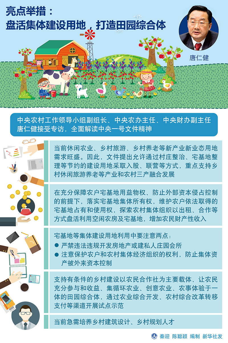 亮点举措:盘活集体建设用地,打造田园综合体 唐仁健说,当前休闲农业、乡村旅游、乡村养老等新产业新业态用地需求旺盛。因此,文件提出允许通过村庄整治、宅基地整理等节约的建设用地采取入股、联营等方式,重点支持乡村休闲旅游养老等产业和农村三产融合发展。 文件强调,要认真总结农村宅基地制度改革试点经验,在充分保障农户宅基地用益物权、防止外部资本侵占控制的前提下,落实宅基地集体所有权,维护农户依法取得的宅基地占有和使用权,探索农村集体组织以出租、合作等方式盘活利用空闲农房及宅基地,增加农民财产性收入。 他指出,宅基地等集体建设用地利用中要注意两点:严禁违法违规开发房地产或建私人庄园会所;注意保护农户和农村集体经济组织的权利,防止集体资产被外来资本控制。 文件还提出,支持有条件的乡村建设以农民合作社为主要载体、让农民充分参与和收益、集循环农业、创意农业、农事体验于一体的田园综合体,通过农业综合开发、农村综合改革转移支付等渠道开展试点示范。