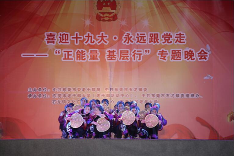 中共广东省委老干部局关于开展以“畅谈十八大以来变化、展望十九大胜利召开”为主题的正能量活动的通知》(粤老干通〔2017〕25号)文件精神,东莞市委老干部局高度重视、积极响应,3月24日,联合中共东莞市石龙镇委在石龙镇老城区人民广场举办以“喜迎十九大 永远跟党走 ----正能量基层行”的专题晚会。此次晚会由市老干部大学(活动中心)、石龙镇组织人事办、石龙文化广播电视服务中心、东泰社区老年大学共同承办。 晚会在开场舞《中国梦 我们的梦》中拉开帷幕,来自东莞市老干部艺术团、东泰老年大学和石龙镇健身舞协会的老同志用积极乐观、热爱生活的阳光心态感染基层群众,唱响主旋律,传递正能量,以最美的舞蹈、最动听的歌声赞美幸福生活,深情表达他们对党和国家的感激之情和美好生活的祝愿,以实际行动为党委政府加油鼓劲,为事业发展点赞喝彩。