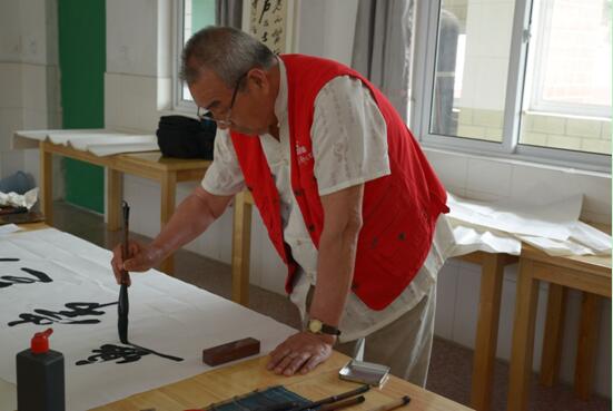 6月13日,老干部之家书画协会常务副会长时玉岭、副会长谭正源,以及省直老战士合唱团支教队队长于谦,来到山东省济南市长清区广里小学,为该校新建成的孔子学堂书写“孔子语录”。 广里小学一直都注重传统文化的传承,学生在读书期间广泛涉猎《弟子规》、唐诗、宋词的经典篇目。今年春天,在省直老战士合唱团支教队的引荐下,广里小学向中国孔子基金会提出申请,建立孔子学堂。