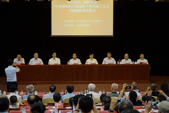 9月19日上午,“不忘初心,永跟党走”中央国家机关离退休干部喜迎十九大书画摄影展在康铭大厦举办开幕式。中央国家机关工委副书记陈存根,民政部党组书记、部长黄树贤,工委副书记姚志平、常大光,工委委员、办公室主任刘涛,中组部老干部局副巡视员赵胜利,全国老龄办党组成员、副主任肖才伟,全国人大机关研究室原副主任程湘清,中央纪委驻最高人民法院纪检组原组长李玉成,原中央纪委驻国内贸易部纪检组组长靳玉德,原铁道部副部长国林,中国地震局原党组成员、副局长修济刚,中央国家机关工委原工委委员、组织部部长李振国,中央国家机关工委原工委委员、宣传部部长陈祥如,中央国家机关工委老龄办副主任李瑛、夏九焘,巡视员高弘倩、副巡视员张淑兰,民政部办公厅主任张卫星、中国老年报社社长、党委书记徐华等领导嘉宾出席,中央国家机关离退休干部工作部门负责同志、获奖离退休干部代表340余人参加。开幕式由工委老龄办常务副主任王立连主持。 开幕式上,工委副书记常大光宣读了书画摄影展获奖个人和单位名单,工委副书记陈存根宣布书画摄影展开幕,与会领导共同为获奖单位和个人代表颁奖。 本次展览由工委老龄办主办、中国老年报社承办,共有69家中央国家机关离退休干部部门参与,报送作品1062件,经过专家评审挑选出其中的310件,于9月19日至22日在康铭大厦进行公开展览。举办“不忘初心,永跟党走”中央国家机关离退休干部喜迎十九大书画摄影展的主旨在于,积极引导中央国家机关离退休干部通过书法、绘画、摄影等艺术形式,回顾峥嵘岁月,畅谈发展变化,讴歌美好生活,讲好中国故事、弘扬中国精神、传播中国声音,为党和人民事业增添源源不断的正能量,为迎接党的十九大胜利召开营造良好氛围。 |