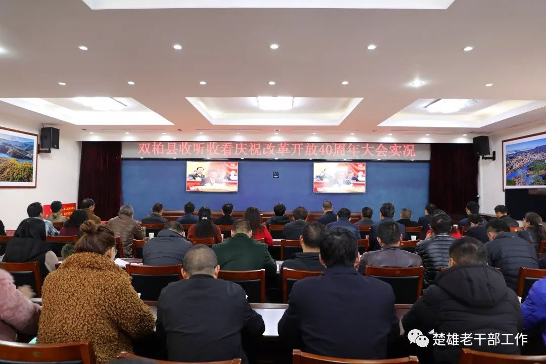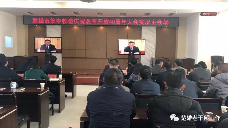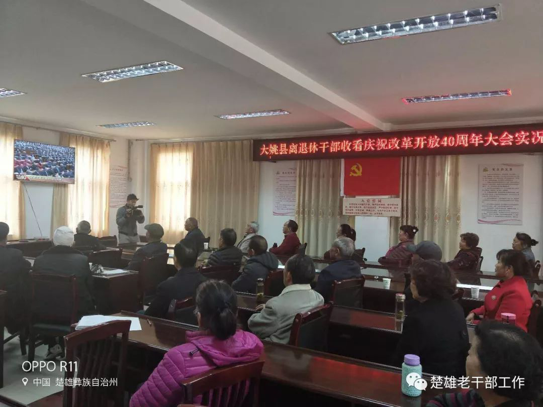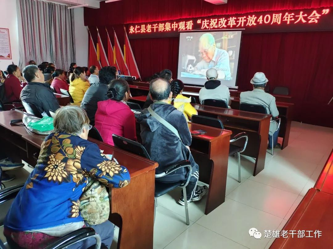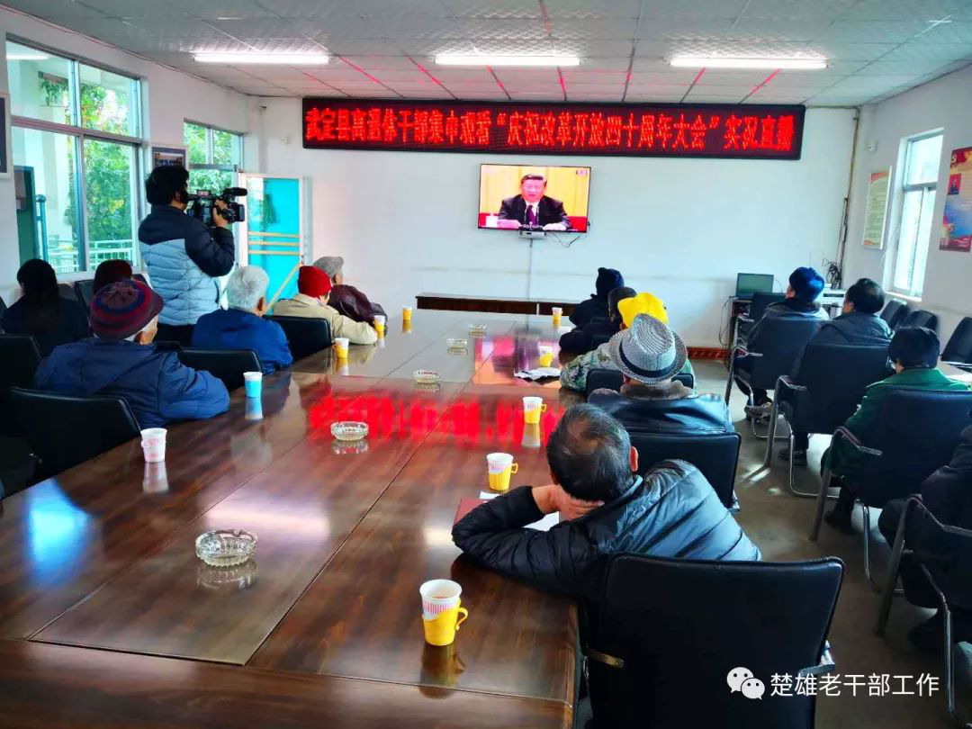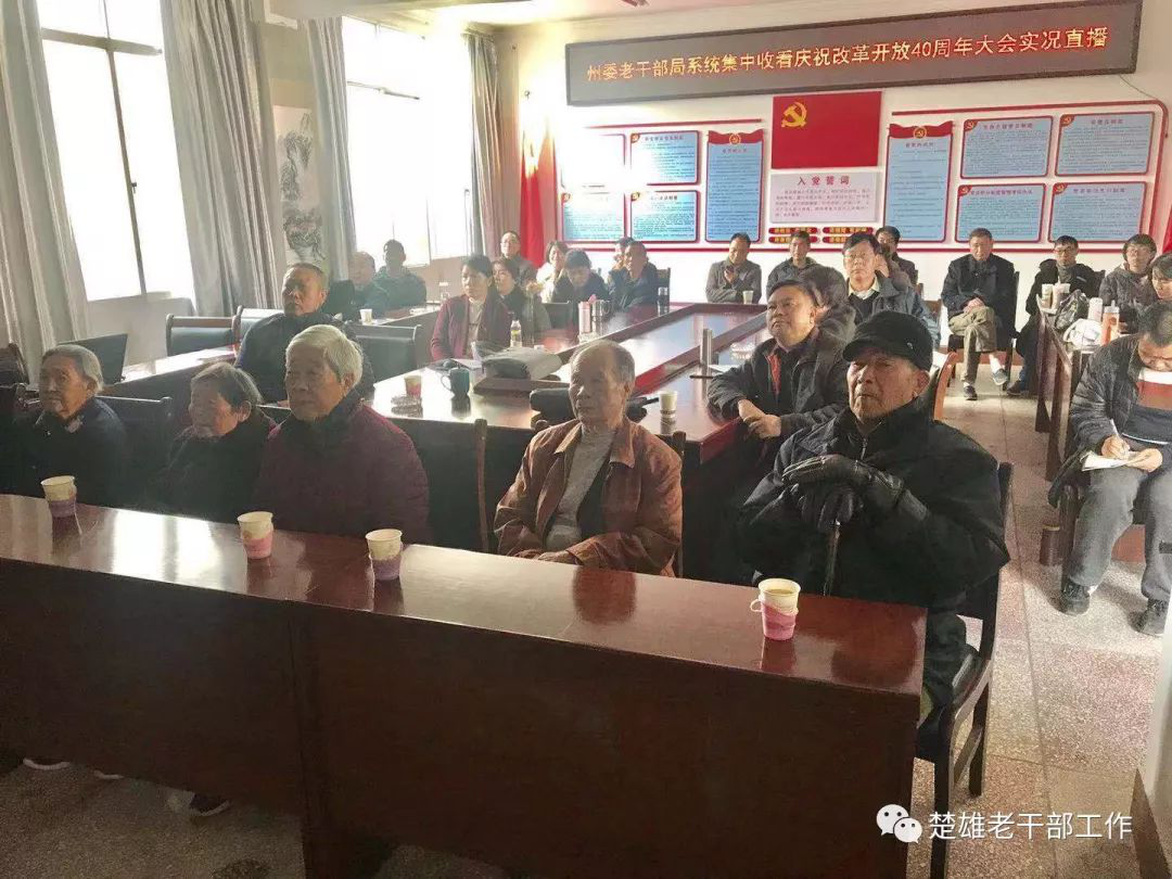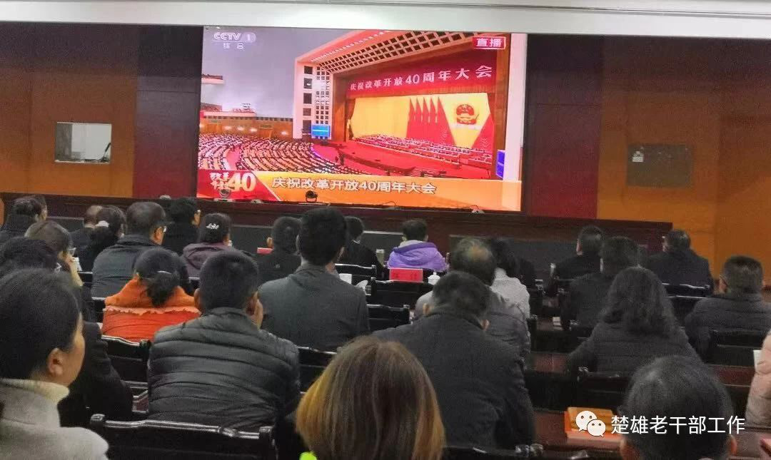 2018年12月18日上午10时,庆祝改革开放40周年大会在人民大会堂举行,习近平总书记出席并发表重要讲话。 云南省楚雄州离退休干部和老干部工作者通过多种形式,及时收看收听大会盛况。 州委老干部局系统干部职工和部分离退休干部代表集中收看庆祝改革开放40周年大会现场直播。 楚雄市委老干部局干部职工集中收看了庆祝改革开放40周年大会实况。 双柏县委老干部局集中收看庆祝改革开放40周年大会。 南华县委老干部局组织全县离退休干部收听收看庆祝改革开放40周年大会,70余名老干部到场集中收看,近千名老干部在单位、党支部和家里收看直播。 姚安县委老干局采取组织部分老干部在老干部活动中心集中收看、各老干部党支部按照就近就便原则小范围集中收看、通过电话、微信等方式通知异地居住和行动不便老干部在家自行收听收看等方式,多举措组织老干部、老党员收听收看庆祝改革开放40周年大会实况。 大姚县委老干部局组织离退休干部集中收看庆祝改革开放40周年大会实况。 永仁县在老干部活动中心组织70余名老干部进行了集中观看。 元谋县委老干部局采取多种方式组织发动老干部观看学习。 武定县委老干部局组织38名离退休干部和全体干部职工在活动中心集中收看直播实况,聆听习近平总书记重要讲话,开展讨论,畅谈和点赞改革开放40年来所取得的伟大成就以及身边发生的巨大变化,寄语改革开放再出发。其他身体不便不能参加集中观看的在家通过电视、手机、收音机等,积极收听收看大会直播实况。 禄丰县委老干部局参加全县集中收看大会直播实况。