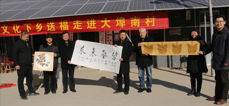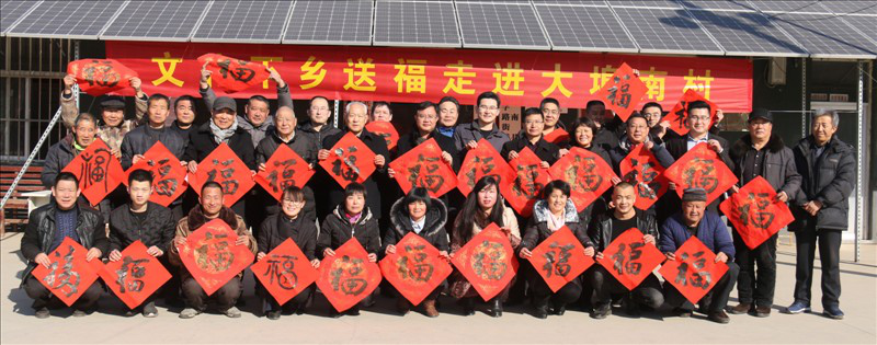 “一帆风顺吉星到,万事如意福临门”, 2019年1月26日,春节临近,山东沂蒙书画院、莒南县老年大学、莒南县老年书画研究会的书画家们怀着对老区人们的热爱和深厚感情来到临沂市莒南县十字路街道大埠南村,为村民挥毫泼墨书写对联300余副,福字400余幅,写字作画60余幅。大红的“福”字,充满着欣欣向荣的景象,让村民们爱不释手。书画家们还把精心书写的春联送到村里的贫困户手中,让他们感受到浓浓的节日气氛,为新春的小村增添了欢乐和温暖。