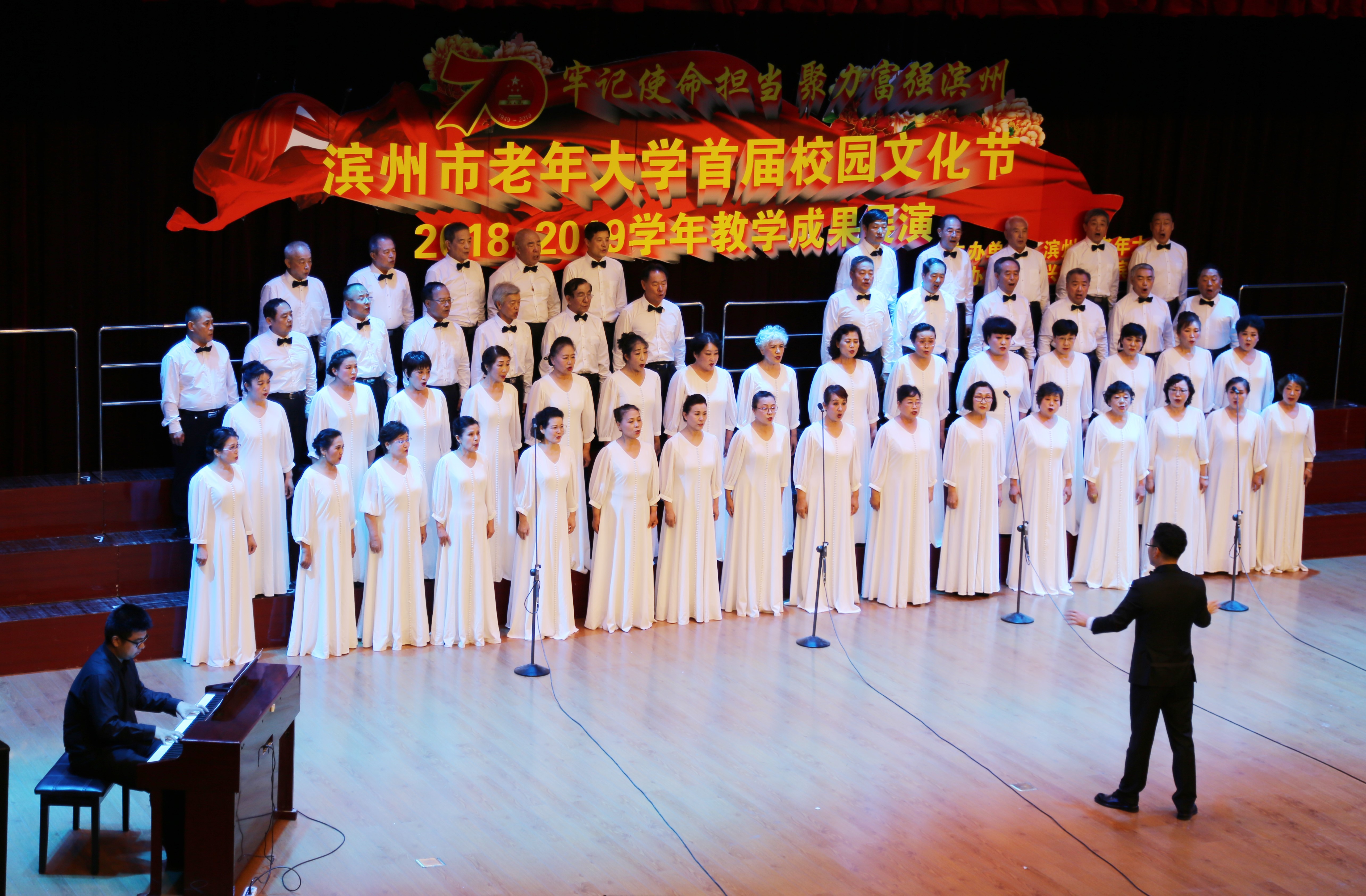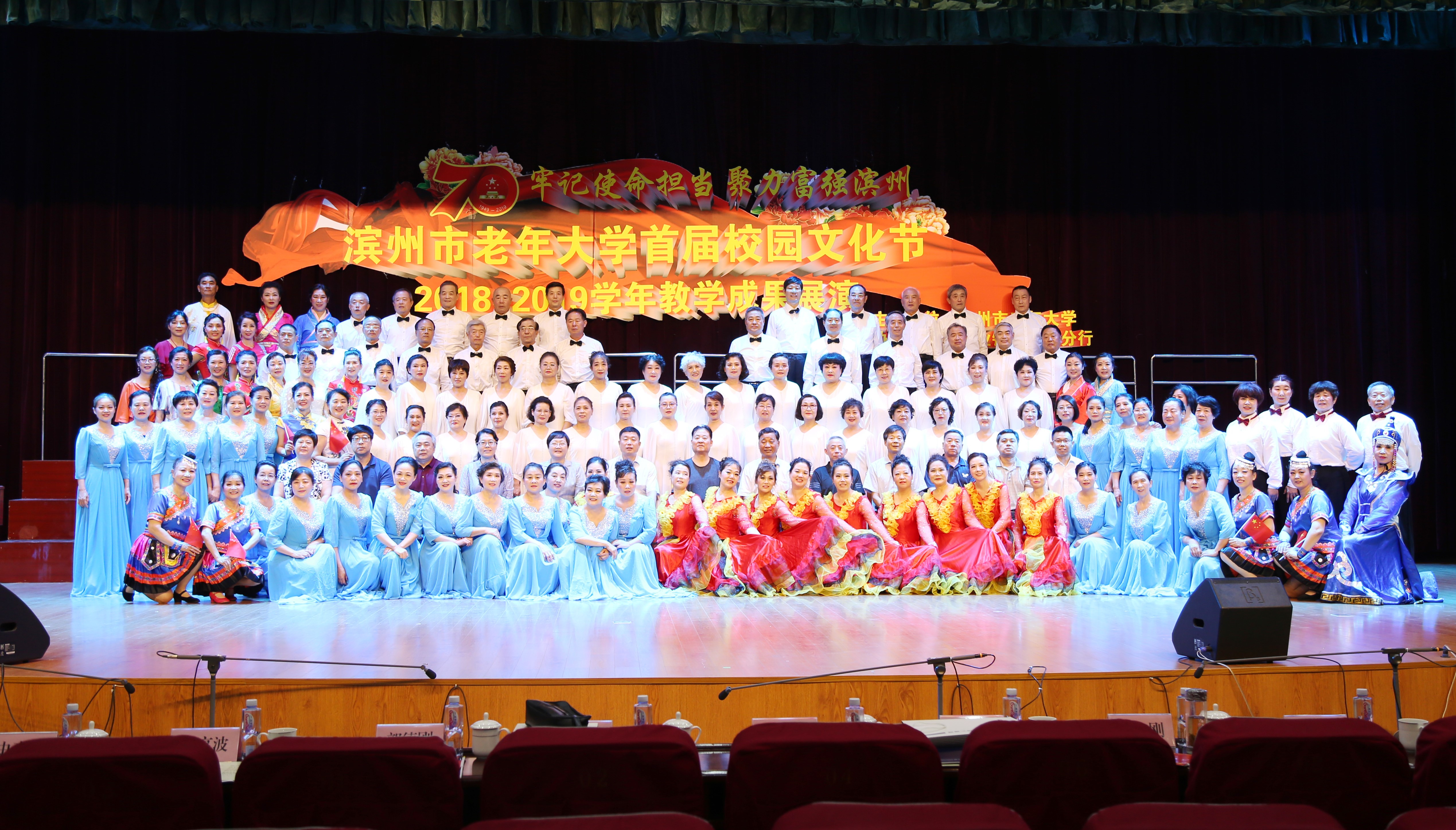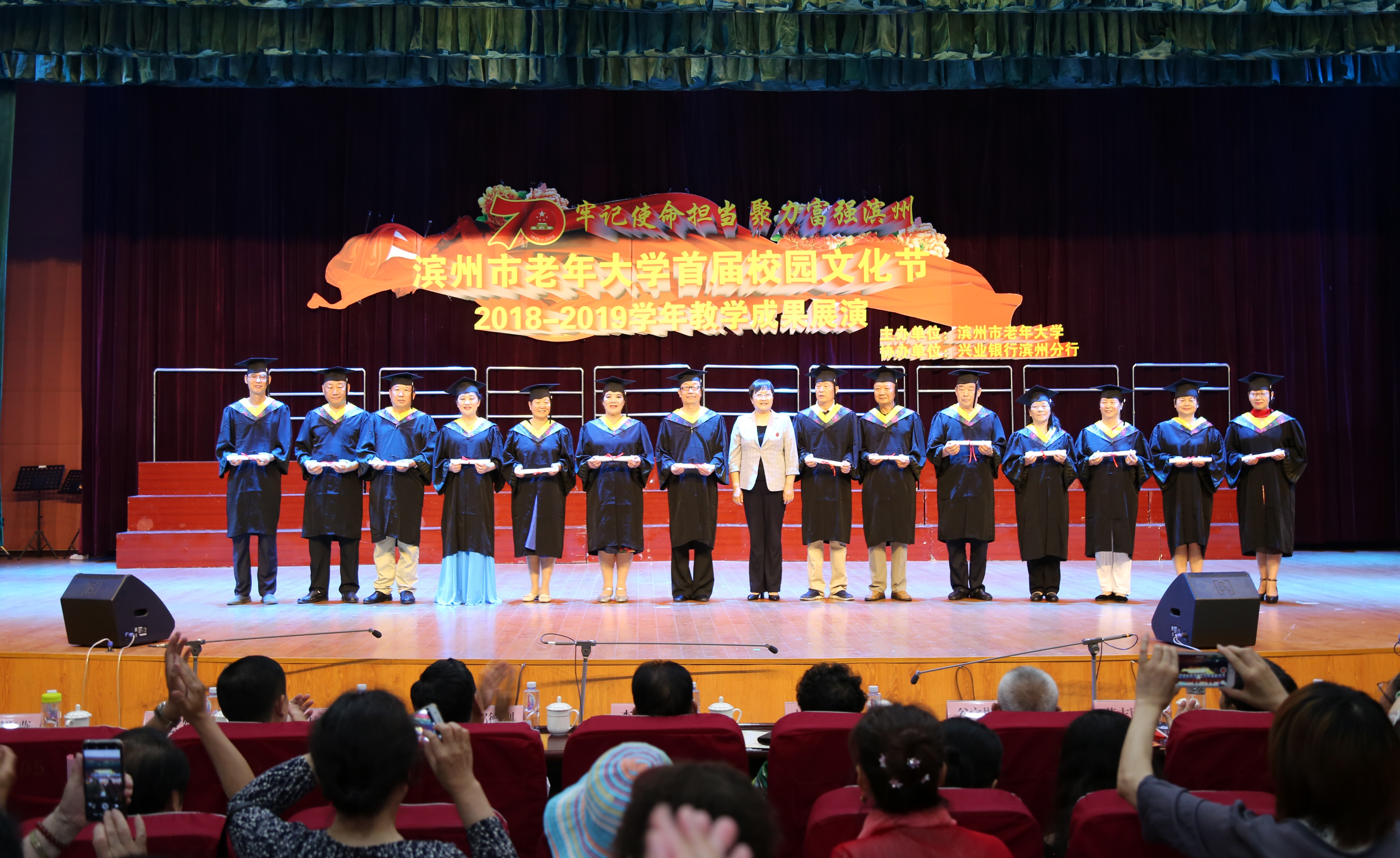 牢记使命担当,聚力富强滨州。6月15日上午,在市老年大学多功能厅,滨州市老年大学首届校园文化节 2018—2019学年教学成果展演举办。市关工委常务副主任李成明,市关工委副主任郭德刚、杨淑云等出席。 展演现场,一曲《井冈山上军旗红》的民乐合奏声此起彼伏,令人不得不驻足聆听,优美动人的舞蹈《板凳上的山歌》、内外兼修的模特走秀《读中国》、唯美浪漫的萨克斯合奏《红歌联赛》、慷慨激昂的混声合唱《忆秦娥·娄山关》、大合唱《祖国不会忘记》等14个节目轮番上演,老年学员们用优美的旋律、动人的歌喉、曼妙的舞姿展现出他们的风采。整场演出气氛热烈、高潮迭起,充分展现了老年学员“老有所教、老有所学、老有所乐、老有所为”良好的精神面貌,同时也展示了老年大学的办学成果和师生们追求梦想的风采。值得一提的是,展演同时,市老年大学为2019届毕业学员代表们颁发了毕业证书,给予了老年学员们毕业的仪式感。双鬓染霜的老年学员们身穿学士袍,头戴学士帽,从校长史惠芳手中接过毕业证书,布满皱纹的脸上却洋溢着青春的光彩。最后,现场全体人员共唱《我和我的祖国》,共同庆祝新中国成立70周年、建党98周年,来歌颂伟大的祖国、伟大的党和改革开放取得的成就,充分展现了广大学员“牢记使命担当、聚力富强滨州”的夕阳风采。 市委组织部副部长、老干部局局长王亨波,市委老干部局调研员谷守彬,市委老干部局副局长、市老年大学校长史惠芳,市委老干部局副局长、市老干部活动中心主任荣志刚,市党员教育与党建信息化管理中心主任周海燕,市老干部活动中心副主任、干休所所长杜立新,市关心下一代教育发展中心主任宁绍海,市政协社会法制委原主任傅光家,市委老干部局原调研员董建国,市老年大学副校长王金英、朱见军等参加了活动。 据悉,滨州市老年大学首届校园文化节举办了系列汇演活动。截至目前,学校舞蹈系,器乐系,体育系,音乐、戏曲、人文系等分别举办了汇报展演及精品节目展演;电子琴、数码钢琴、台球、手工制作等专业,在各自教学班中举办了汇报展演;六楼文化长廊中展示了2018-2019学年学员的书法、绘画、篆刻、摄影作品等等。精彩的文艺汇演,充分体现了市老年大学的办学成果,彰显了广大学员有作为,有进步,有快乐,奋斗新时代、共创美好未来的不老情怀,为“富强滨州”建设贡献了力量。