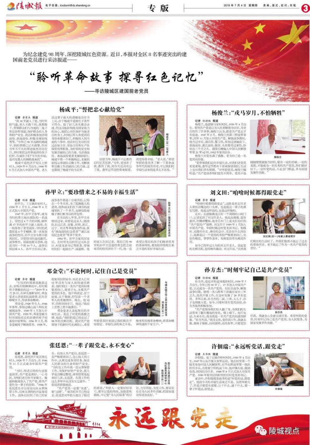 为纪念建党98周年,深挖陵城红色资源。近日,《陵城报》对德州市陵城区8名事迹突出的建国前老党员进行采访报道—— 聆听革命故事 探寻红色记忆 “我18岁就入了党,当时年轻气盛,别人不敢干的,我都敢干,带领群众们与当地的二鬼子和皇协军周旋,保护群众的人身和财产安全。我还积极参加济南战役、淮海战役,积极支援前线等等。”今年已90岁高龄的杨成平,别的事情已记不清楚,但对当年不平凡的事迹依然历历在目,并时常把这些事迹讲给孩子们听,告诫孩子们“今天的幸福,是用无数人的牺牲换来的”。 杨成平是经济开发区土桥村人,1929年9月出生,1948年5月正式加入中国共产党。老人说这辈子最大的遗憾是没有当上兵,由于杨成平是独生子条件不符合,报了好几次名都没去成,但这没能影响他为国家效力的决心,他把心用在保护当地老百姓身上,时刻以军人和党员的身份来要求自己,积极投入到当地的斗争中。他在村庄先后担任过治保主任、贫协主任和生产队保管员等职务,为村里的安全和发展贡献自己的力量。当济南战役、淮海战役要求支援前线时,杨成平第一个积极响应,支援到前线从事部队后勤工作,为解放军后勤工作贡献自己的力量,这也算圆了杨成平的当兵梦。 回望当年,杨成平不忘教育后代忆苦思甜,“当年,党培养了我、教育了我,到今天还没有忘了我,逢年过节还经常来探望,我觉得很幸福。”老人说,“希望年轻的党员多了解一下革命战争年代的艰苦历史,牢记我们的幸福生活来得是多么不容易。” (记者 黄有杰) 孙甲立,于集乡孙家村人,1930年1月生人,1948年4月正式加入中国共产党。 1947年,孙甲立参军,成为当时的第五炮兵部队的一名战士。仅经过4个月的训练,刚年满17岁的孙甲立就上战场,在一线参加了莱芜战役,当时的武器仅是4个手榴弹。第一次参加战争的经历,孙甲立至今都不愿再回忆,只觉得当时战况激烈,战争惨烈,场面血腥又恐怖,他说当时一个班10个人,战争后仅回来4人。孙甲立告诉记者,战争条件都是十分艰苦的,记得在一个冬天里,为了抵御敌人的进攻,他和战友们在下满雪的战壕里趴了一个多月,也曾惊险地被子弹打断身后的背包带。 在当兵的七年里,孙甲立未曾回过家,未曾见过亲人,随部队去过江苏、安徽、河南、浙江、辽宁、河北等多地参加作战,获有“淮海战役纪念奖章”“渡江战役纪念奖章”等多个奖章。 1954年,孙甲立复员回家后,在村里先后担任过大队会计,村党支部书记等职务,带领村民们一起搞生产、谋富路。他的家人告诉记者,现在已经90岁的孙甲立还是经常会把之前艰苦的经历讲给下一代,他一直希望让现在的孩子们继承优秀的革命传统,要加倍珍惜现在来之不易的美好幸福生活。 (记者 刘瑶) “打仗的时候都是跑着过去,穿梭在枪林弹雨中,有时候和子弹擦肩而过……”2019年6月25日,在神头镇靳家村,邓金堂老人讲述着抗战故事,忆往昔峥嵘岁月,传承革命精神。 邓金堂,1928年生人,1946年参军,参加过确山战斗和抗美援朝战争。1949年1月加入中国共产党。1955年,邓金堂被当时任国防部长的彭德怀授予预备役中尉军衔。1956年3月,邓金堂被授予解放奖章。1958年,他复员回到家乡,至此老人已有12年没有与家人取得通讯联系。他时刻以一名共产党员标准要求自己,要求子女,永葆共产党员的本色。他平和淡定,甘于寂寞,乐于奉献,抒写着一个老军人的英雄情怀。现在,他92岁,仍然坚持学习。他说:“政治上思想上绝不能落后。” 邓金堂老人谈起现在的幸福生活,表达了对党的感激之情。他说:“我们的党已经走过了98年的光辉历程,我对共产党领导下的新时代充满信心,希望年轻党员时刻谨记我们现在平安稳定、幸福生活的来之不易,继承和发扬革命精神,将革命精神传递到千家万户。” (记者 李哲) 张廷恩,是经济开发区徐庄村人,1926年7月出生,在1946年11月正式成为中国共产党员。 “当时,咱老百姓的生活很是困苦,共产党是真好,一心为民,为咱们老百姓当家做主。俺就积极地加入了共产党,将共产党作为一辈子的信仰。”1946年张廷恩在市公安局大队从事保管工作,后来又调到的市盐务局工作,退休后回到了自己的家乡。自加入共产党后,张廷恩一直严格要求自己,全心投入到工作中,认真完成各项任务,保证人民群众的生命和财产安全。“当时在工作中我一直从事保管工作,为保护好财产安全,我几乎是没睡过整觉,夜里经常是起来好几次,去巡逻。在我工作的这么多年中从没发生过意外。”张廷恩骄傲地说。 “共产党员一定要‘先进’,要‘过硬’。” 艰苦的岁月已经过去,张廷恩对年轻人提出了殷切的希望:“年轻人一定要好好学习,要牢记党的传统,加强党性锻炼,牢记党“为人民服务”的宗旨,力尽所能,为党工作,要实实在在为人民多作贡献,把国家建设得更加美好。” (记者 黄有杰) 杨俊兰,是滋镇马家村村民,1930年4月出生。看到共产党是以为人民求解放为宗旨,为老百姓作了许多事,杨俊兰认为,跟着共产党走才有前途。1947年2月,杨俊兰到第三野战军参军,同年11月加入中国共产党。解放战争期间,他当过步兵、通讯员、警卫员,参加过诸城战斗、淮海战役、渡江战役,腿部、头部都受过重伤,卧床达三个月之久。建国后被编入中国人民解放军第21军62师,1952年复员回乡。 杨俊兰对党充满了感激,更为自己是一名党员而自豪。 “