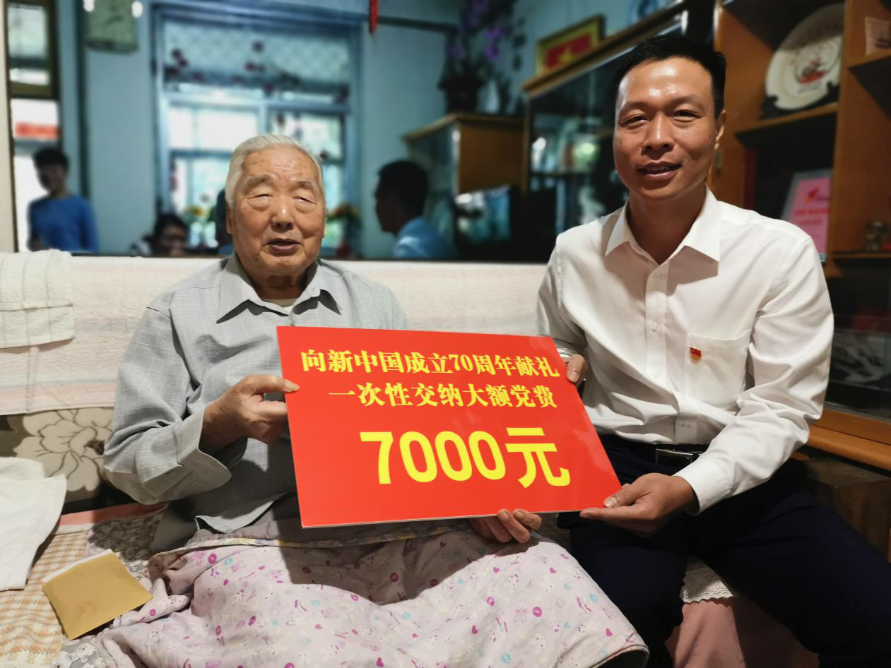 在新中国70华诞即将到来之际,淄博市淄川区耄耋之年的老干部、老党员白光标、谭德芝夫妇向党组织一次性交纳7000元大额党费,向新中国成立70周年献礼,真切展现了他们守护初心、爱党爱国的政治品格,表达了他们对党和祖国的深情厚意。