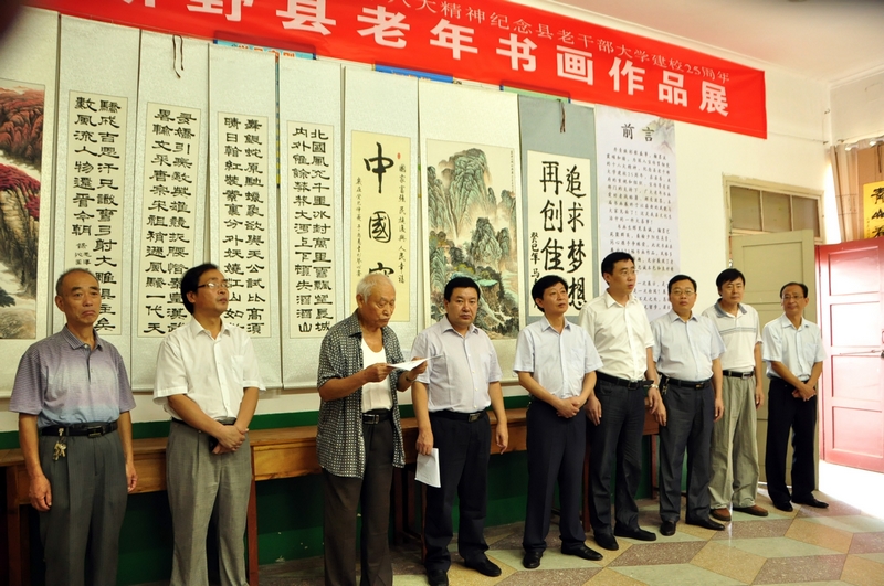 近日,河南省新野县老干部大学建校25周年老年书画作品展,在该县老干部活动中心隆重开幕。县委常委、组织部部长郭富玉、县人大副主任李延华、县政府副县长方明洋、县政协副主席丁文豪和老干部大学副校长马志斌、郑方成出席开幕式。参加开幕式的有老干部大学的部分师生,还有县委组织部、宣传部、老干部局的有关领导和同志,共100余人。开幕式由郭富玉主持,马志斌、方明洋先后讲话。 这次以深入宣传贯彻党的十八大精神,纪念老干部大学建校25周年为主旨的书画展,参展老同志49人,其中年龄最大的88岁,最小的55岁,平均年龄71岁;共展出书画作品121幅,其中书法81幅,绘画40幅。这些作品内容向上,风格各异,充分展示了老同志们的书画成果和精神风貌,抒发了他们对党、对祖国、对人民、对生活的炽热情感,表达了他们对高举十八大旗帜,为实现中华民族伟大复兴的中国梦而奋斗的坚定信念和决心。本期书画展展期16天,8月31日闭幕。 新野老干部大学 河南省新野县委老干部局