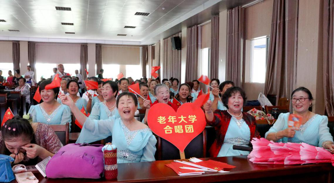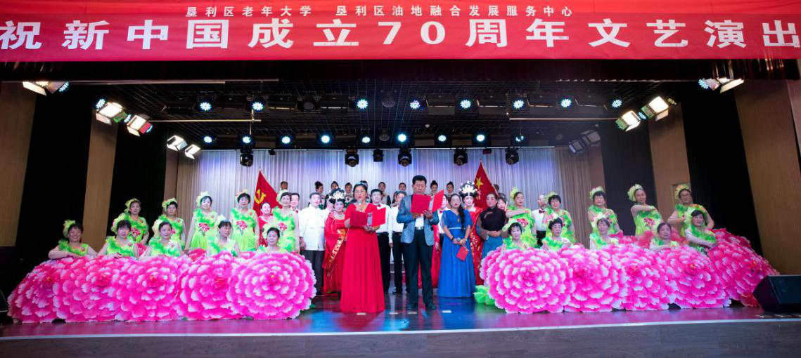 日前,东营市垦利区老年大学、垦利区油地融合发展服务中心在老年大学北二楼礼堂举行庆祝新中国成立70周年文艺演出。垦利区原政协主席、垦利区关工委主任单连涛;垦利区人大常委会原第一副主任、老年大学名誉校长孙海君;垦利区人大常委会原副主任徐广增;垦利区人大常委会原副主任、垦利区书法协会主席郝建起;垦利区人大常委会原副主任、老年活动中心主任周德光;垦利区政协原副主席、垦利区中华优秀传统文化交流推广协会会长周爱莲;垦利区政协原副主席宋建明;胜利油田钻井地质录井公司党委原副书记、工会主席、垦利区老年大学金秋艺术团名誉团长、胜利乐团团长张力;垦利区组织部副部长董月文;垦利区编办原主任、老年体协秘书长任兰新;垦利区区退役军人事务局副局长黄春峰;垦利区文化馆刘海涛等领导应邀出席。 演出共10个节目,包含器乐合奏、大合唱、舞蹈、萨克斯合奏、戏曲、古筝、太极、情景剧等多种精彩缤纷的节目形式。老年大学学员们以自己的方式献礼祖国,热情讴歌了新中国成立70年以来所取得的辉煌成就,充分展现了我校老年人老有所为、老有所乐的精神面貌。整台文艺汇演主题鲜明、精彩纷呈,赢得了现场观众的阵阵喝彩。