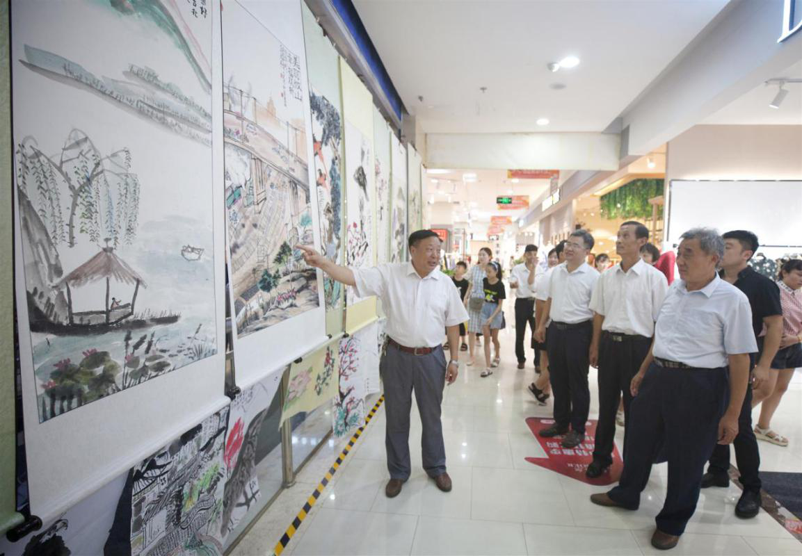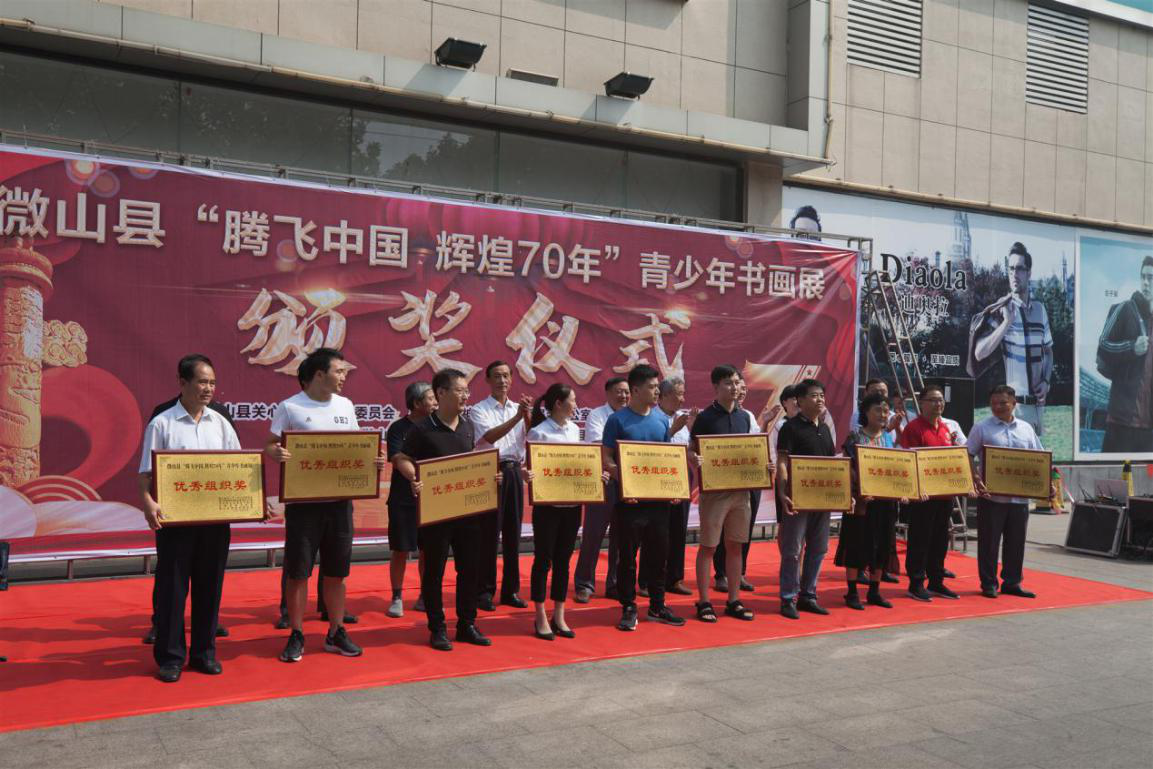 为庆祝中华人民共和国成立70周年,推动全县关心下一代工作和青少年才艺培养活动深入开展,激发广大青少年创作热情,展现青少年良好精神风貌,近日,济宁市微山县关工委、县文明办、县委老干部局、团县委、县教育和体育局等单位联合举办了微山县“腾飞中国 辉煌70年”庆祝中华人民共和国成立70周年青少年书画展活动。 获奖作品展示和颁奖仪式在新供销大厦广场举行。县关工委主任马祥秋,常务副主任、秘书长蔡成全,副主任于恒启,县委组织部副部长、老干部局局长、县关工委副主任殷昭浩,县委宣传部副部长张颖梦,团县委副书记华宏卿,县教体局副局长陈庆明,以及县书协、美协、供销大厦相关负责同志出席仪式并为获奖集体和个人颁奖。县委老干部局副局长杜高新主持活动。本次书画展共征集书画作品500余幅,经专家评审,最后评出优秀组织奖10名,书法类优秀奖158名,绘画类优秀奖35名。 本次书画展活动启动以来,深受广大中小学生和家长们的支持和欢迎,青少年们踊跃参与,以书言志,以画传情,充分运用笔墨丹青艺术形式,回顾新中国70年的光辉历程,追寻民族复兴梦想的伟大征程,讴歌了新中国取得的举世瞩目的成就,抒发了爱党爱国爱家乡的情怀,集中展示了微山县青少年红色教育的丰硕成果,持续推动全县“传承红色基因、争做时代新人”主题教育活动深入开展,以实际行动向中华人民共和国成立70周年献礼!