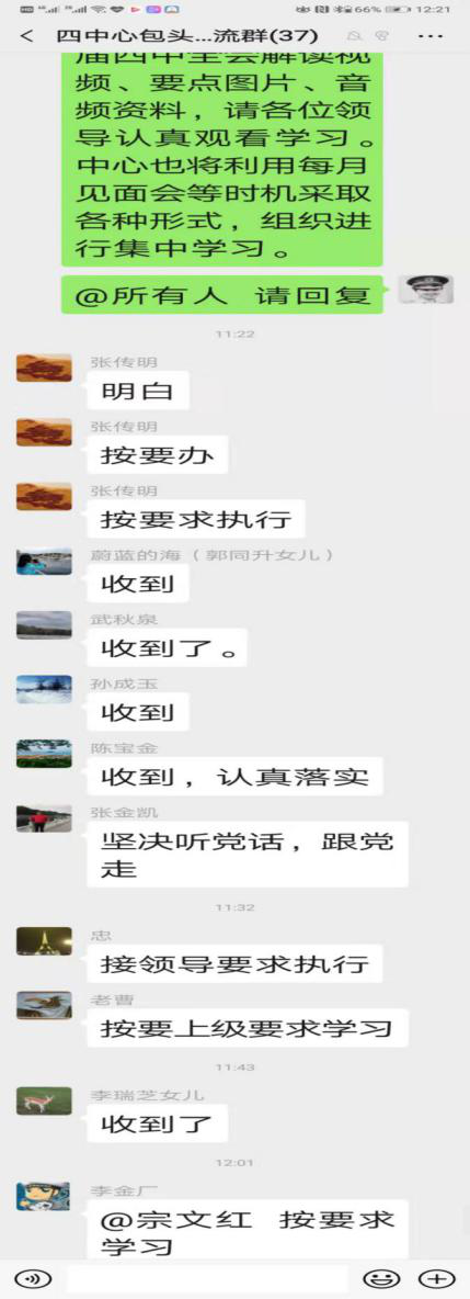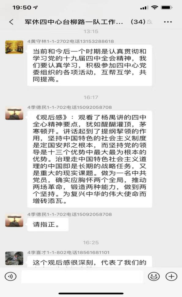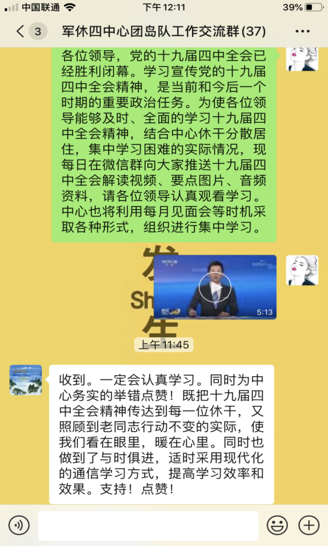 按照市局《关于组织军休干部学习宣传贯彻党的十九届四中全会精神的通知》要求,青岛市军队离休退休干部第四服务中心充分利用微信群组织休干学习十九届四中全会精神。 军休四中心为青岛市唯一纯分散接收安置军休干部的军休服务机构。休干党员730余名,分散居住于青岛市五区60多个社区街道,集中学习难度大;且军休干部普遍年纪大,不便于阅读手机、报纸等文字性学习材料。中心工作人员制作了图文并茂地十九届四中全会要点PPT,以图片的形式通过微信群向军休干部进行推送。 为让休干能够更加便捷学习党的十九届四中全会精神,中心工作人员从网上查阅大量中央、各地方十九届四中全会精神解读视频,经过比对选取了中央电视台《短评如何准确领会十九届四中全会精神》;河北电视台十九届四中全会精神系列解读《“一次具有开创性里程碑意义的重要会议”》《“总体目标”呼应中国特色社会主义制度发展的三个阶段》《释放“中国之治”最强信号》;宁夏电视台《十九届四中全会精神微党课:用法治实现国家治理现代化》等10余个视频节目,按照微信传输文件小于25M的要求进行压缩,制作成5分钟以内的小视频,在微信群每日进行推送。 此外,中心工作人员还把学习强国中十九届四中全会音频资料按进度进行推送。 通过图片、视频、音频推送,保证各个年龄层次、各种身体状况的休干都能及时、全面的学习十九届四中全会精神,收到休干一致好评,取得良好效果。 |