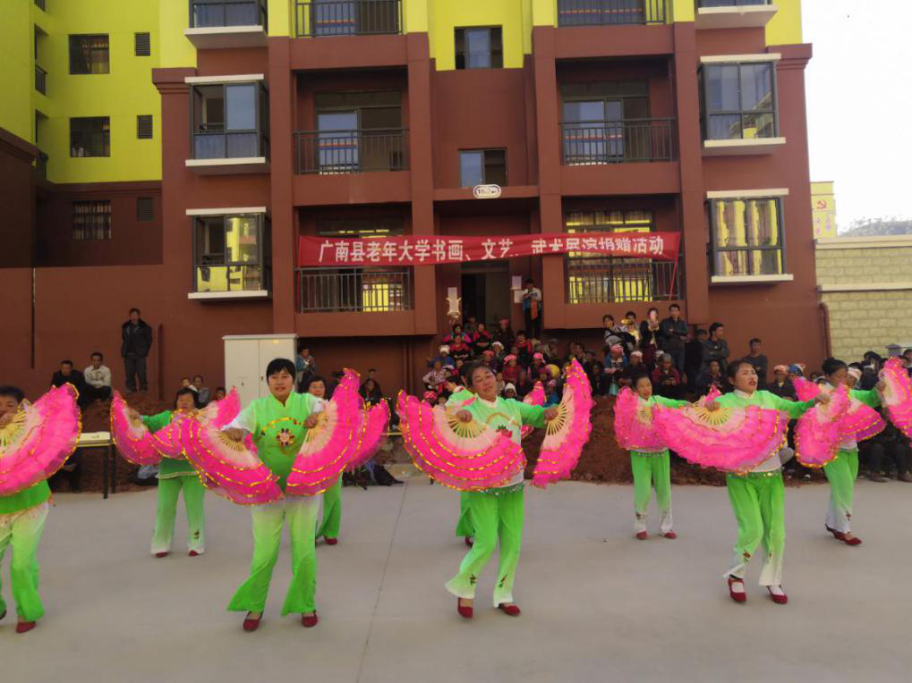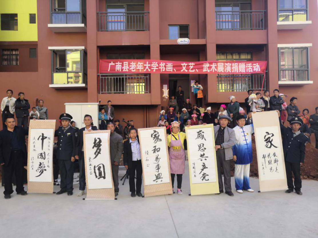 为了全力做好广南县银发助力脱贫攻坚工作,用文化传递爱心,用书画作品激发贫困人群内生动力。12月15日,中共云南文山州广南县委组织部组织老年大学全体学员,深入易地搬迁安置点圆梦社区开展书画文艺武术展演捐赠活动。 广南县老年大学文艺班积极响应“老干部为党的事业增添正能量”的号召,到圆梦社区开展文艺武术演出。舞蹈《红红火火》为整场演出拉开序幕,演出中,老同志们个个精神饱满,热情洋溢,高亢的歌声感染着在场的每位观众,用他们的方式,助力脱贫攻坚,尽一份爱心力量,也进一步丰富了他们的精神文化生活。活动现场,书画班的学员代表现场创作30余幅,以“中国梦”“感恩共产党”“梦圆”为主题书画作品,并全部赠送给了贫困群众。 此次活动旨在弘扬民族传统文化,积极助力精准脱贫,从扶精神、扶志气、扶文化方面与贫困群众共享“文化大餐”。希望通过共享书画、文化扶贫这种方式鼓舞士气,为脱贫攻坚注入新活力,弘扬传统文化,全面助推脱贫攻坚。 |